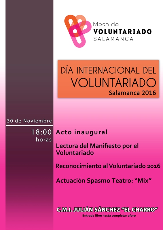 Las actividades del Día Internacional del Voluntariado -designado el 5 de diciembre por la Asamblea General de Naciones Unidades- comenzarán a las 18.00 horas, estando previsto que tras la inauguración se proceda a la Lectura del Manifiesto por el Voluntariado 2016. A continuación, se realizará el Reconocimiento al Voluntariado, tanto a entidades como a personas voluntarias a nivel individual. Por último, dentro de las actividades del Día Internacional del Voluntariado, tendrá lugar la actuación "MIX" de la compañía salmantina Spasmo Teatro.
