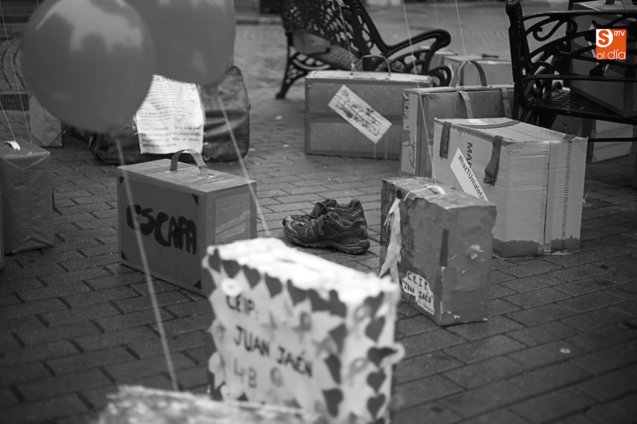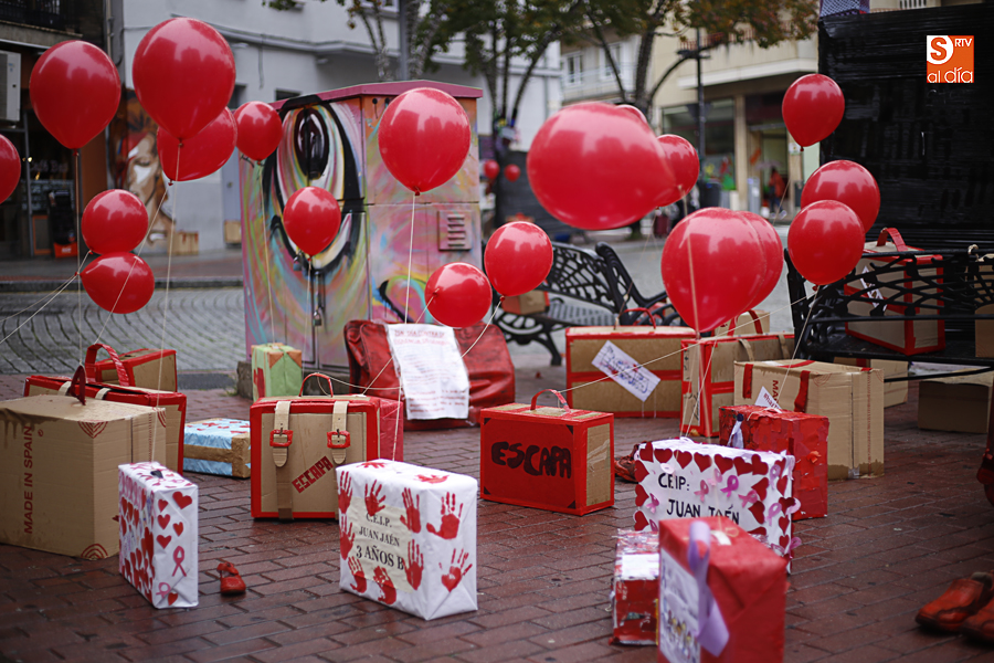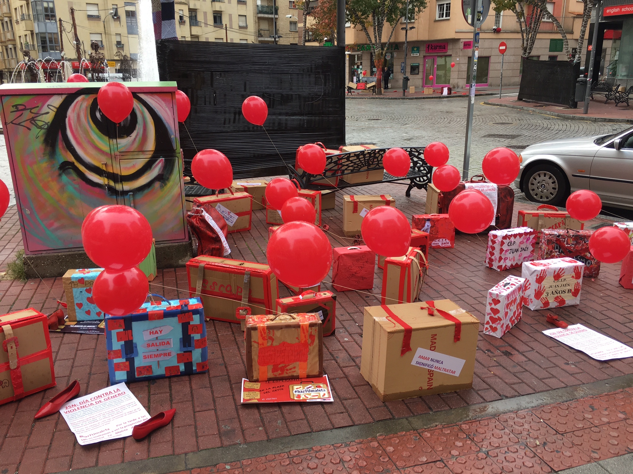 Así, en la plaza del Oeste se han instalado maletas hechas con cajas de cartón, "como símbolo de una vía de escape para las víctimas que sufren esa violencia y no se atreven a dar el paso de escapar o bien hacen mucha referencia a coger la maleta e irse".