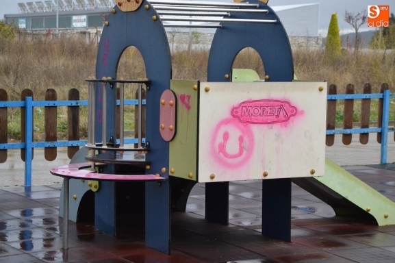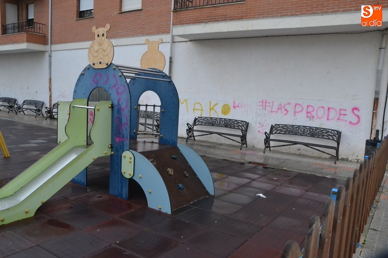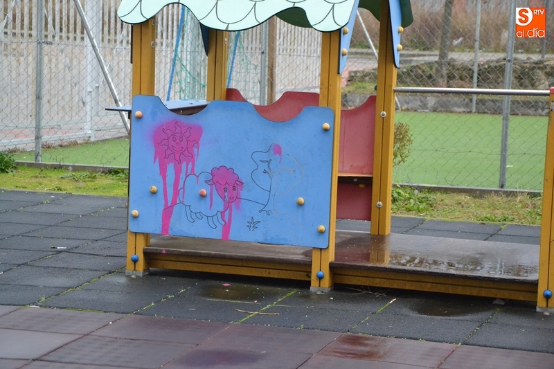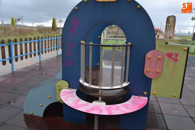 La Bibliocaseta no ha sido el único espacio de Ciudad Rodrigo que ha sufrido en las últimas horas la acción de los vándalos. El parque infantil de la calle Hermanos García Carraffa también ha sufrido su desagradable visita, en este caso provistos de sprays, con los que han pintado varios de los juegos y han realizado inscripciones en la pared anexa al parque, como se puede ver en las imágenes.