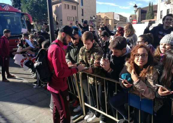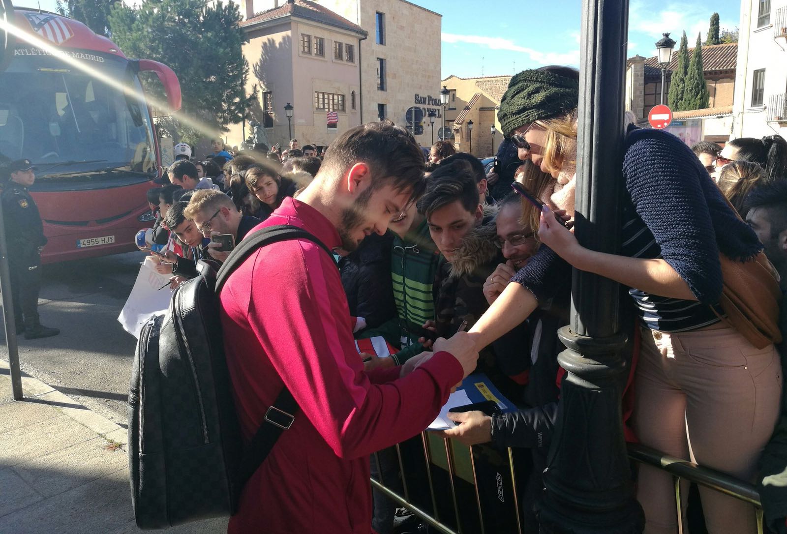 Tal y como estaba previsto, las estrellas del Atlético de Madrid están causando furor en Salamanca. Pese a la ausencia de algunos de los pesos pesados del conjunto de Simeone, como Torres, la llegada de los jugadores ha llamado la atención de cientos de aficionados que se han acercado al hotel en el que se concentra el equipo colchonero para saludarlos y con suerte obtener un autógrafo de alguno de los jugadores más destacados.