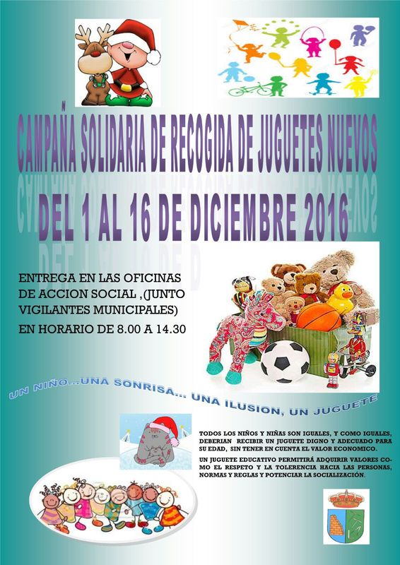 Los juguetes podrán entregarse hasta el próximo 16 de diciembre en las oficinas de Acción Social (Junto a los Vigilantes Municipales), en horario de 8.00 a 14.30 horas de lunes a viernes.