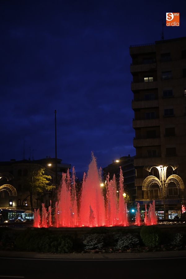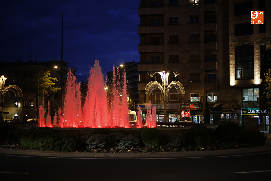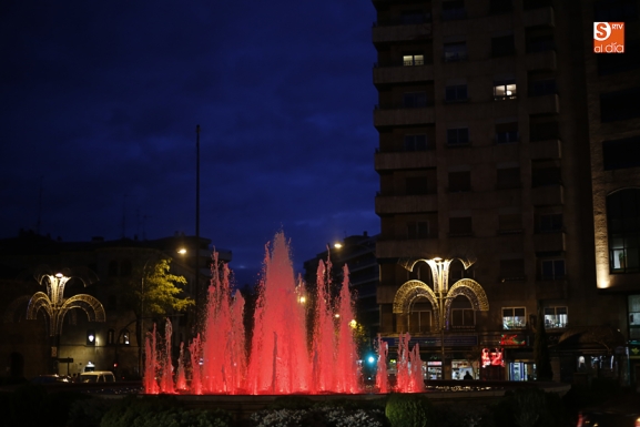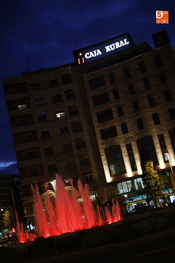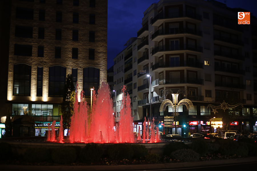 El Ayuntamiento de Salamanca ha iluminado esta noche de color rojo la fuente de la Puerta Zamora con motivo del Día Mundial del SIDA con el que se pretende concienciar a la sociedad sobre los múltiples aspectos de la infección VIH/SIDA.