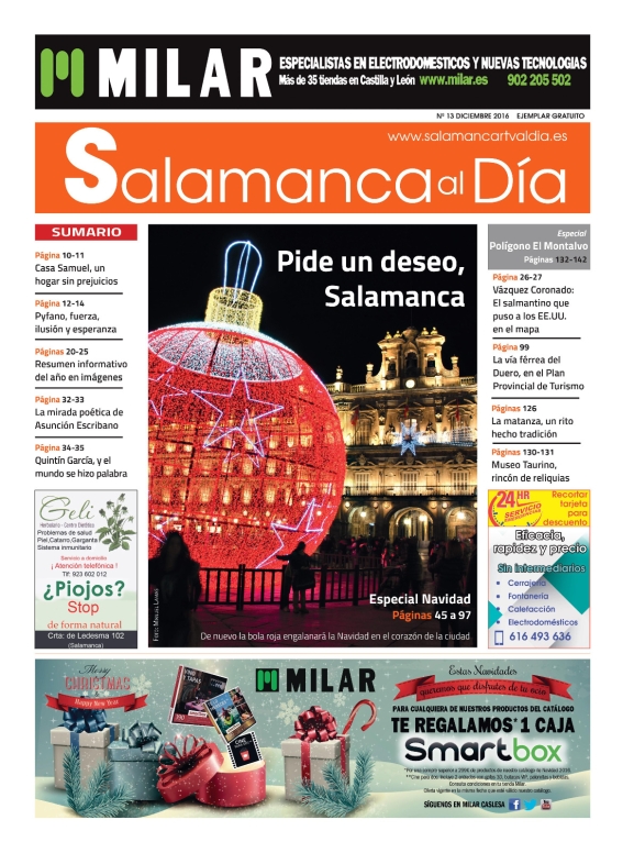 La edición de diciembre ha comenzado a distribuirse en capital y provincia. El periódico acoge las secciones habituales dedicadas a provincia, campo, caza, cultura, opinión, toros, deportes o empresas y especiales sobre la Navidad, el polígono industrial de El Montalvo, o Emprendedores. En su interior, SALAMANCA AL DÍA se hace eco de interesantes reportajes sobre la Casa Samuel de enfermos de Sida tutelada por Cáritas, Pyfano, los barrios Blanco y Pizarrales, entrevistas a Asunción Escribano y Quintín García, la matanza o el turismo en la provincia. En sus páginas, los lectores encontrarán de igual modo un completo resumen de Vázquez Coronado (el salmantino que puso a los EE.UU. en el mapa), una crónica sobre el Museo Taurino o la evolución de Unionistas. El primer periódico gratuito ofrece otros temas interesantes, pero sobre todo lugares y espacios para celebrar estas próximas fechas navideñas.