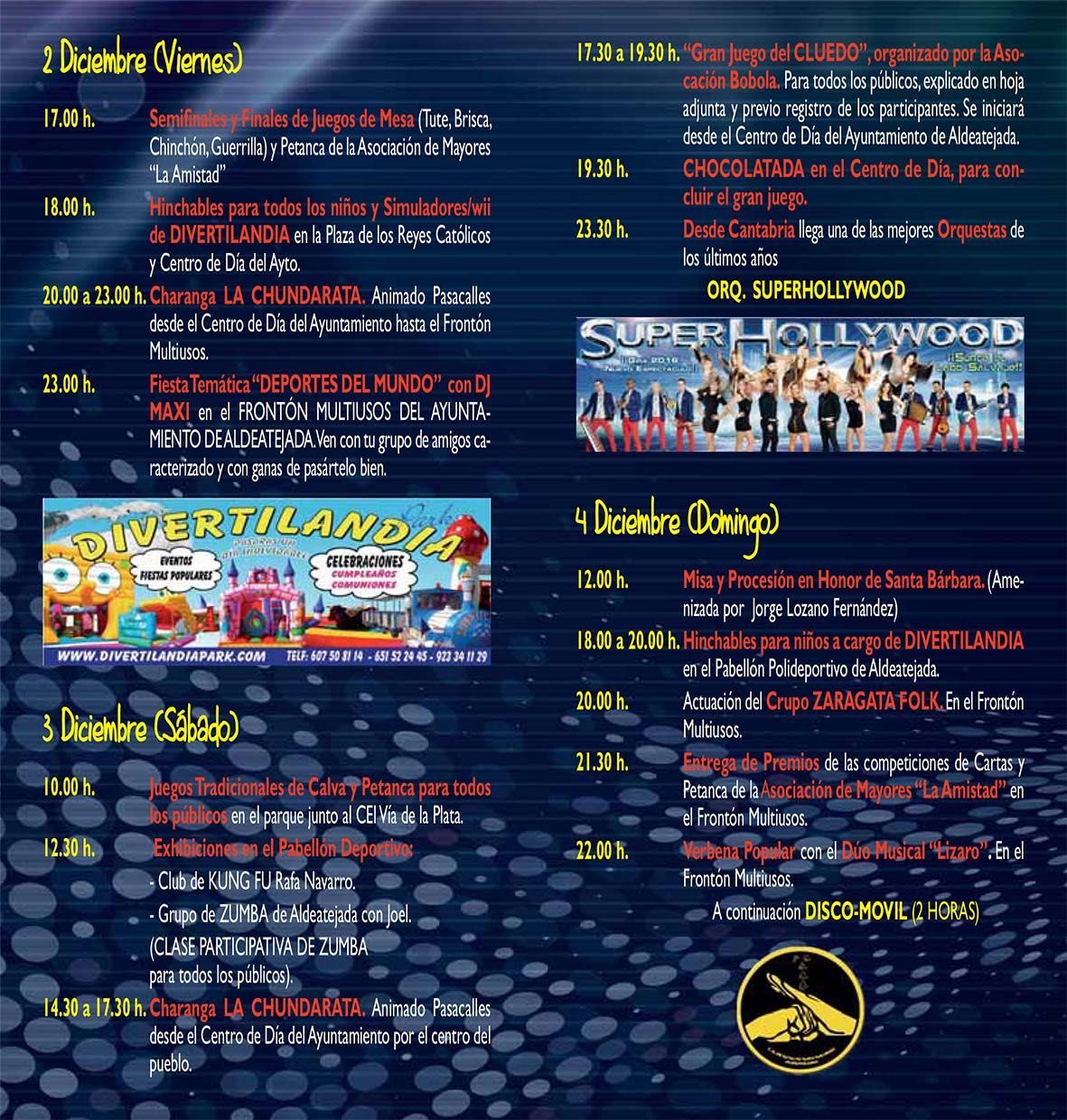 Tras la celebración de una nueva edición de la Feria de la Miel, Aldeatejada vuelve a vestirse de fiesta este primer fin de semana de diciembre para honrar Santa Bárbara, patrona de la localidad. Los vecinos podrán disfrutar durante tres días, desde este viernes hasta el domingo, de la completa programación elaborada por el Ayuntamiento con actividades destinadas a la diversión de todos los grupos de edades.