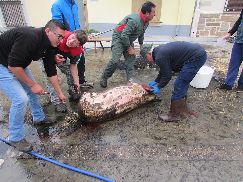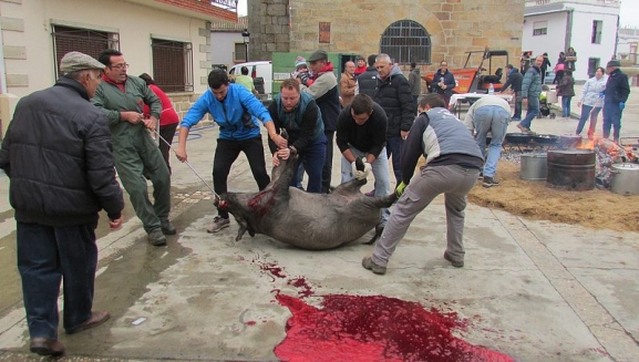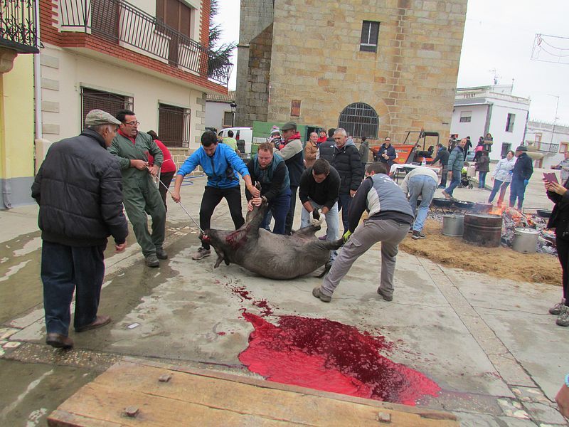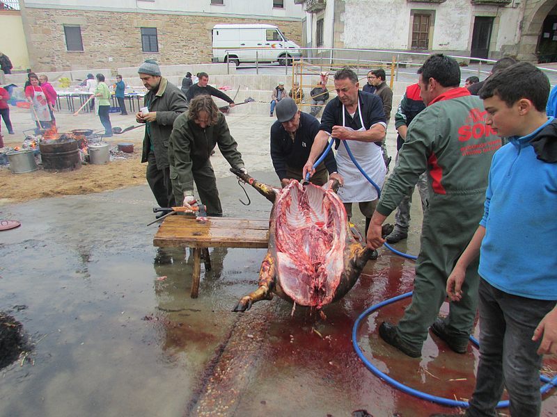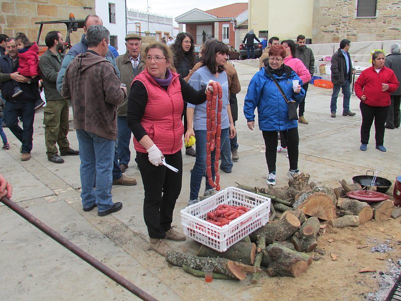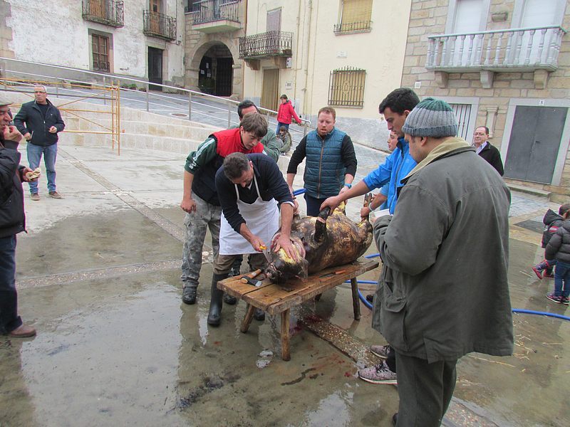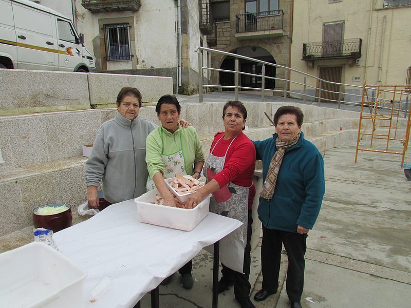 Alrededor del mediodía el protagonista de la jornada, un cerdo ibérico de unos 200 kilos de peso, que aparecía en la plaza del pueblo para a partir de ese momento convertirse en el centro de atención junto al grupo de mujeres encargadas de llevar a buen puerto esta jornada gastronómica por excelencia.