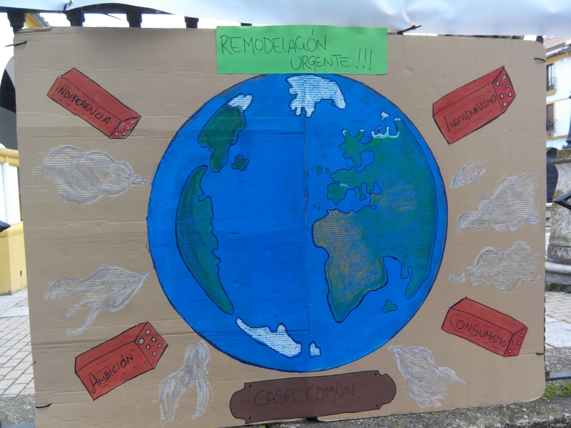 La instalación cuenta con tres carteles. El primero de ellos es un dibujo del Mundo, "nuestra Casa Común, que necesita una remodelación urgente", saliendo disparados en el dibujo "ladrillos con lo que sobra: consumismo, individualismo, indiferencia, ambición,?".