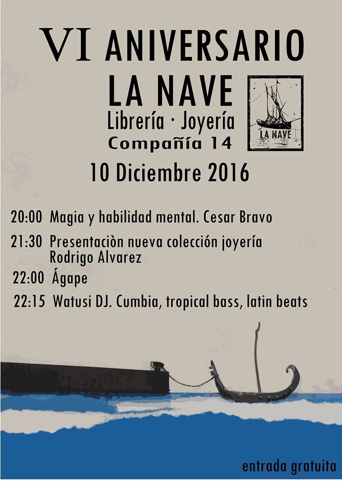 La librería-joyería La Nave (calle Compañía, 14) celebrará este próximo sábado su sexto aniversario con diferentes actividades, que incluyen la magia de César Bravo y la presentación de la nueva colección de joyería de Rodrigo Álvarez. Watusi DJ pondrá la música a este encuentro que comenzará a las ocho de la tarde con entrada libre y gratuita.
