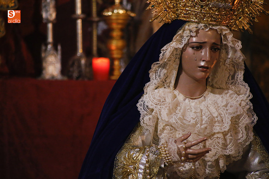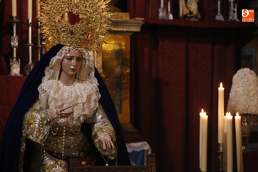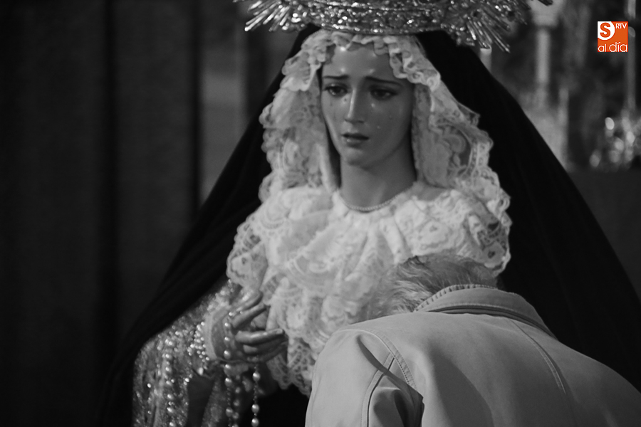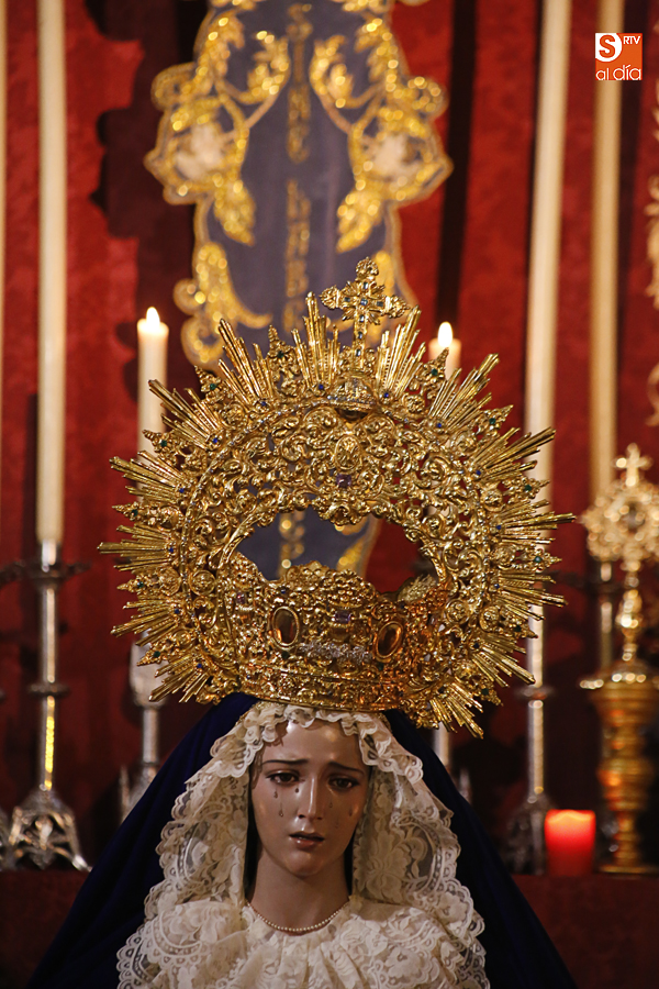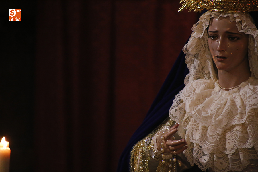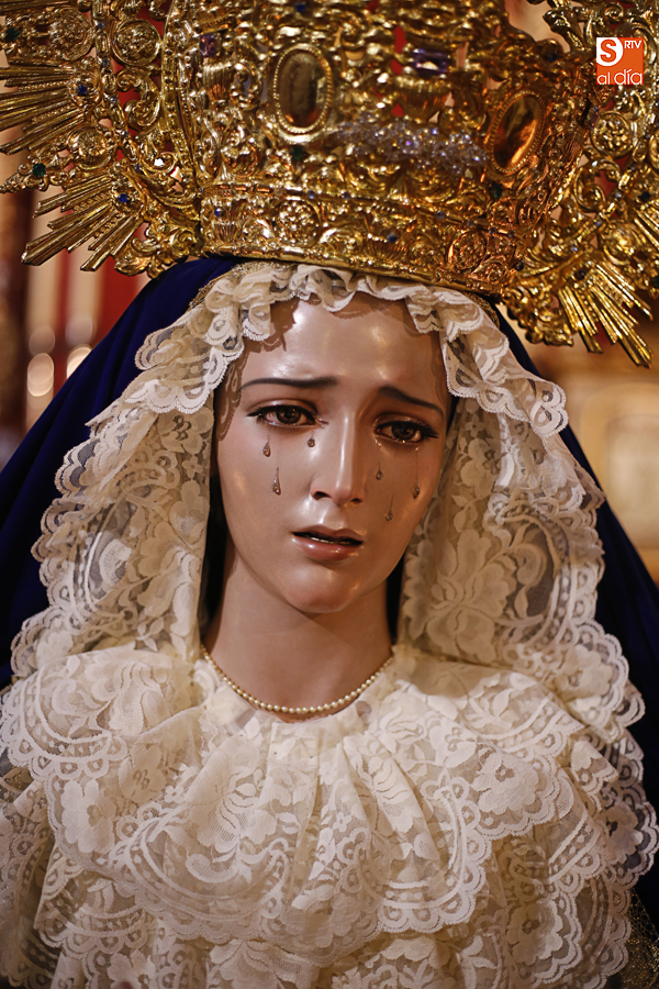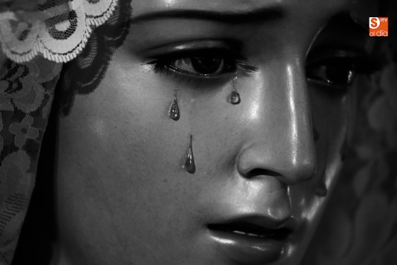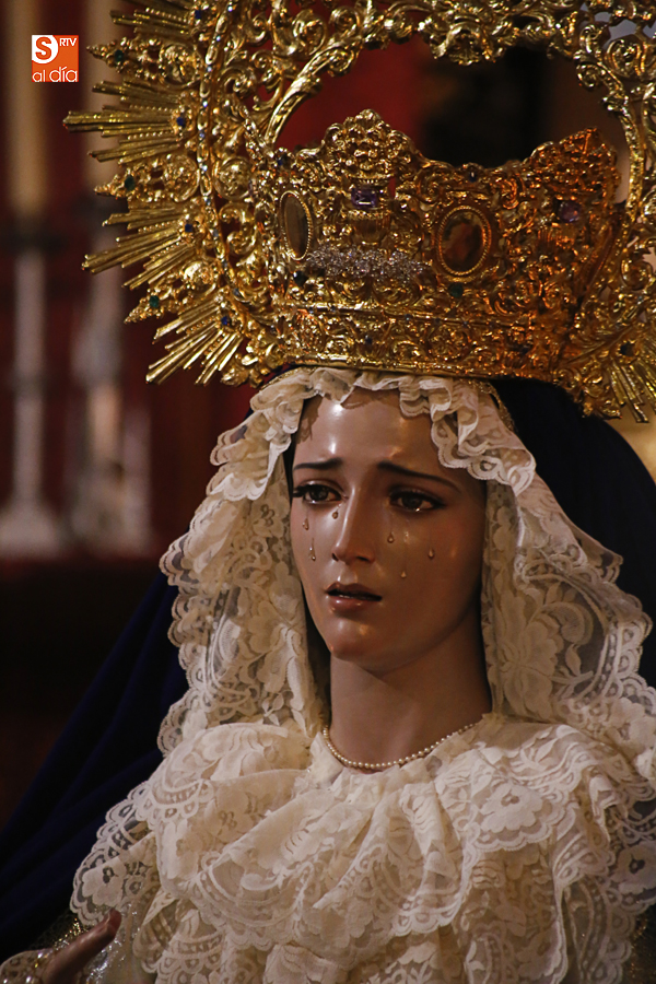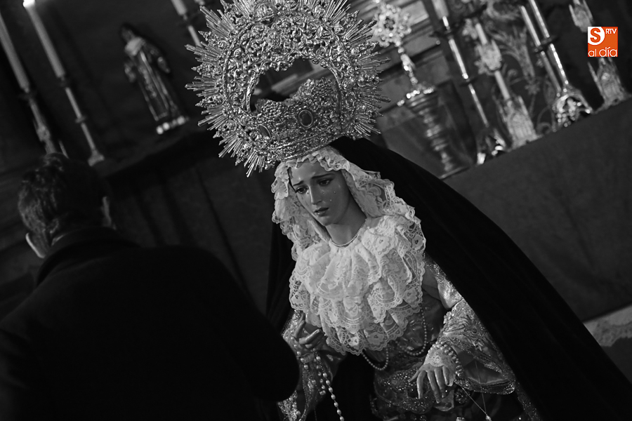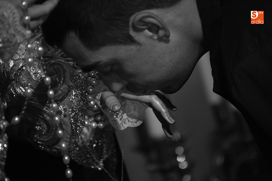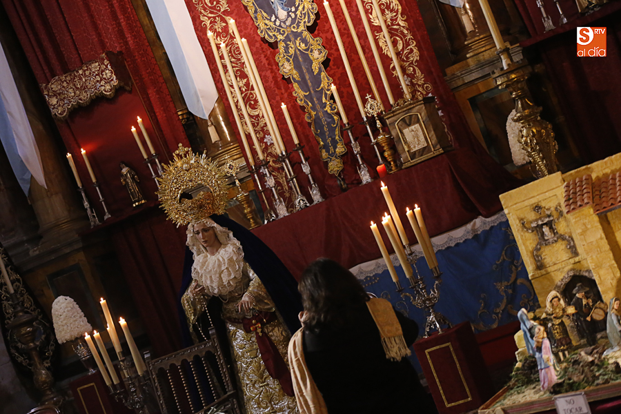 Nunca antes unas lágrimas estuvieron tan bellamente iluminadas por la caridad. Nunca antes unas lágrimas tan bellas aportaron tanto consuelo. De Caridad y Consuelo se han impregnado hoy las paredes de la iglesia de San Benito, que ha celebrado el día de la Inmaculada acogiendo el besamanos de la titular mariana de la Hermandad de Jesús Despojado. Numerosos fieles han pasado por el templo de la calle Compañía para recibir el consuelo de la apenada Madre y disfrutar del curioso Belén de la Hermandad.
