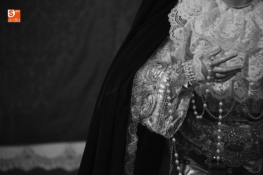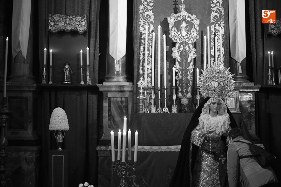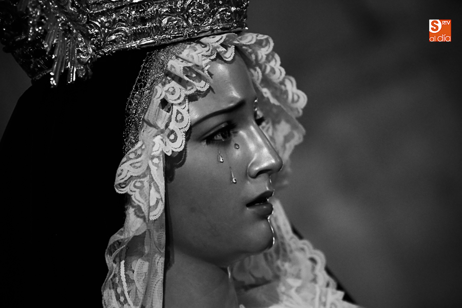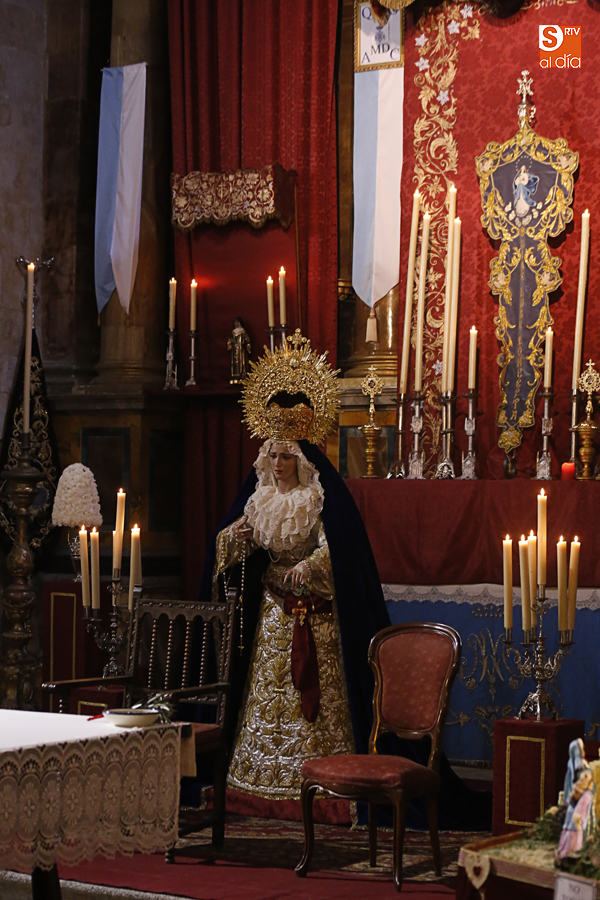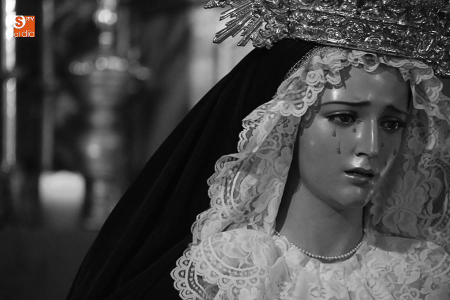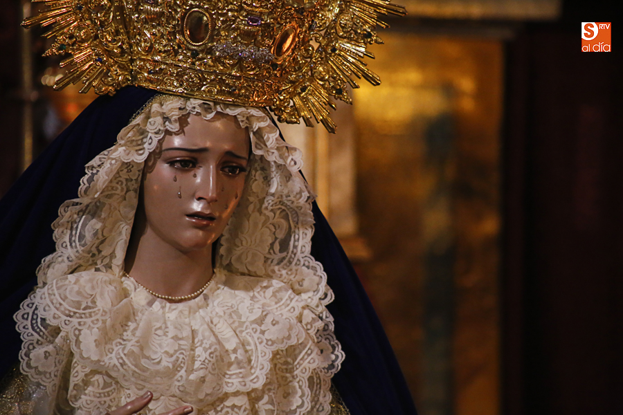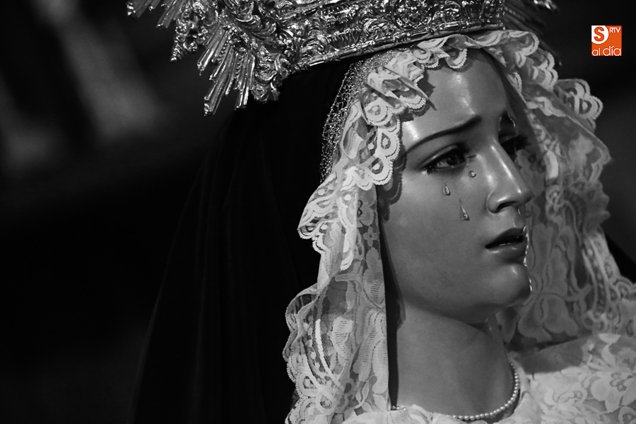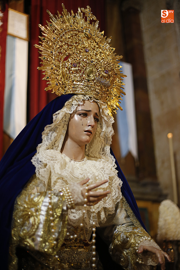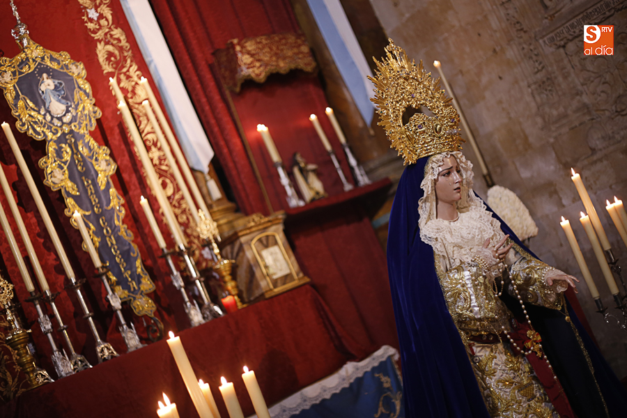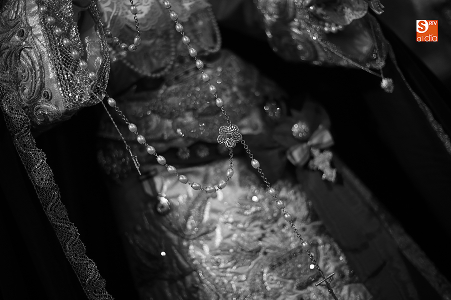 Nunca antes unas lágrimas estuvieron tan bellamente iluminadas por la caridad. Nunca antes unas lágrimas tan bellas aportaron tanto consuelo. De Caridad y Consuelo se han impregnado hoy las paredes de la iglesia de San Benito, que ha celebrado el día de la Inmaculada acogiendo el besamanos de la titular mariana de la Hermandad de Jesús Despojado. Numerosos fieles han pasado por el templo de la calle Compañía para recibir el consuelo de la apenada Madre y disfrutar del curioso Belén de la Hermandad.