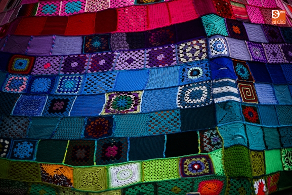 Está hecho de 1.200 cuadrados de punto o ganchillo de 15 x15cm provenientes de una treintena de países