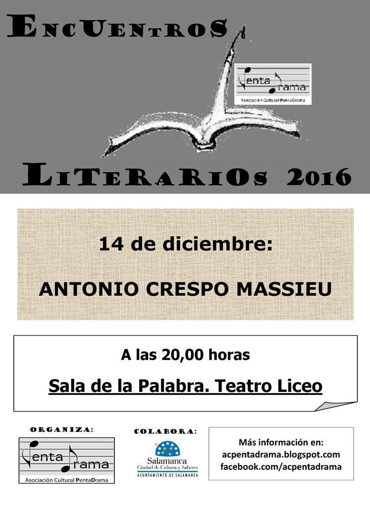 La Asociación Cultural Pentadrama celebrará el próximo miércoles, día 14, un nuevo encuentro literario que tendrá como protagonista al escritor Antonio Crespo Massieu. Será, como de costumbre, en la Sala de la Palabra del Teatro Liceo de Salamanca, a las ocho de la tarde, y está encuadrado dentro de los Encuentros Literarios que se organizan en colaboración con la Fundación Salamanca Ciudad de Cultura y Saberes.