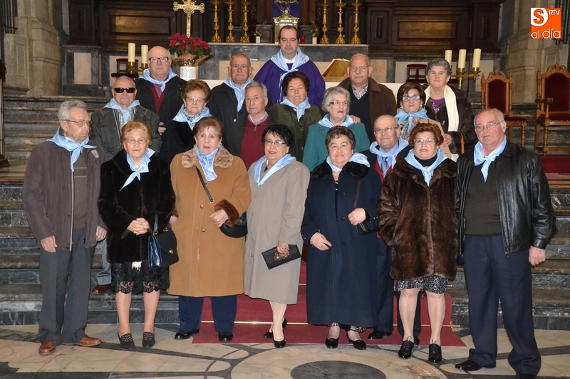 Como manda la tradición, una vez acabada la celebración eucarística, Rafael Caño se anudó el pañuelo azul de la Peña al cuello para formar parte de la clásica foto de familia del encuentro en las escaleras del altar del templo.