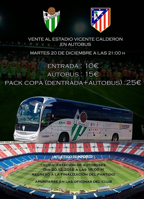 El CD Guijuelo ha organizado ya la expedición de aficionados para el partido de vuelta en el Vicente Calderón frente al Atlético de Madrid. Los hinchas del equipo podrán viajar en autobús y buscar las entradas por su cuenta, u optar por viaje más entrada ofrecida por el club, o finalmente sólo comprar la entrada. El viaje más entrada tiene un precio de 25 euros. El viaje en autobús 15 euros y entrada en fondo norte por 10 euros. La salida del autobús está prevista para el martes 20 a las 16:00 horas. Las entradas están a la venta en las oficinas del club hasta el lunes 19 de diciembre.