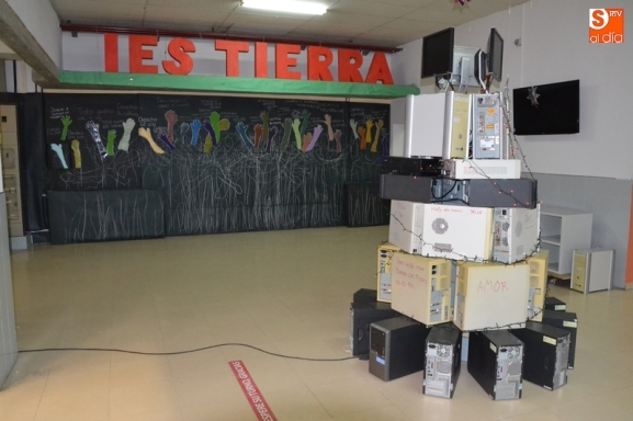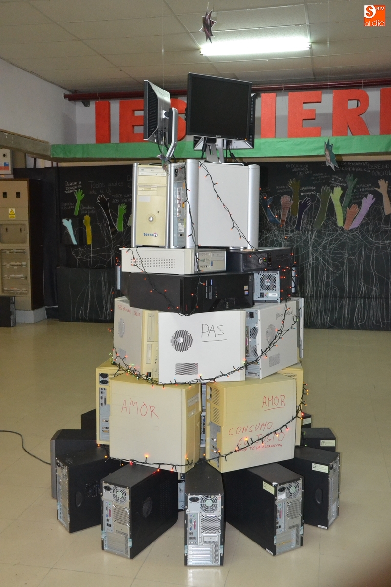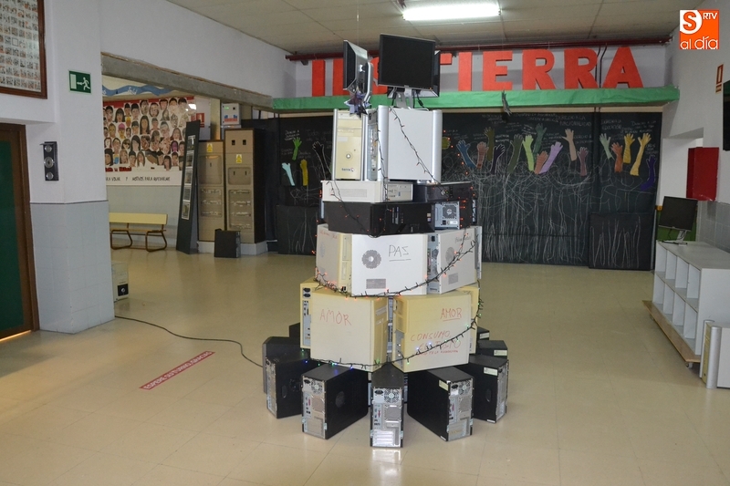 Hay muchos lugares que tienen montajes 'clásicos' en ambos aspectos, pero en otros han decidido innovar, como es el caso del IES Tierra de Ciudad Rodrigo, que un año más ha vuelto a instalar en su hall un revolucionario árbol de Navidad.