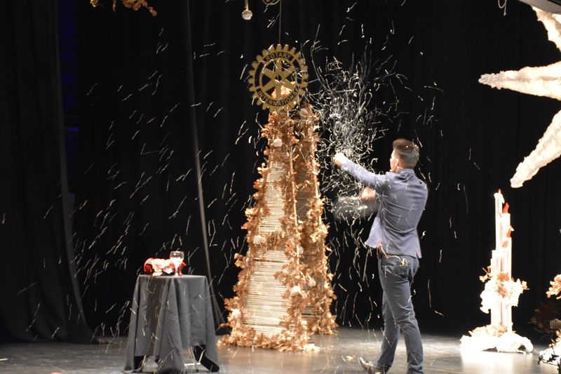 El espectacular escenario ha sido realizado enteramente por Javier Pérez Maíllo, presidente del Cub Rotario de Béjar y montado con la ayuda del resto de los integrantes de esta asociación que viene trabajando, desde hace tiempo, en numerosas causas solidarias, como las becas de libros y material escolar, la Gala Benéfica del Deporte que se celebra hoy, la colaboración con la Asociación Alcohólicos Rehabilitados, la Asociación de Fibromialgia o la Asociación de Familiares y enfermos de Alzheimer, e instalan, cada sábado primero de mes, un puesto en el Mercado de Antigüedades de la Plaza Mayor, en el que venden objetos de segunda mano para mantener el Proyecto Etiopía, iniciado por el fallecido rotario Luis Cuadrado, con el que se prestan servicios sanitarios a tres niñas ciegas, dos de ellas con parálisis cerebral.