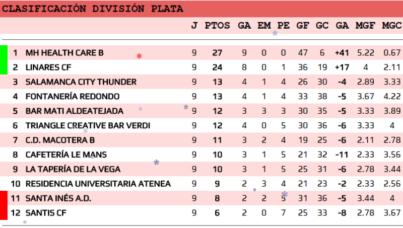 Lo que está claro, jornada tras jornada, en esta División de Plata, es que sólo dos equipos lucharan por ser el Campeón de Liga. Y es que MH HEALTH CARE B y LINARES CF están situados en los primeros puestos con una gran ventaja frente al tercer clasificado que es el SALAMANCA CITY THUNDER.