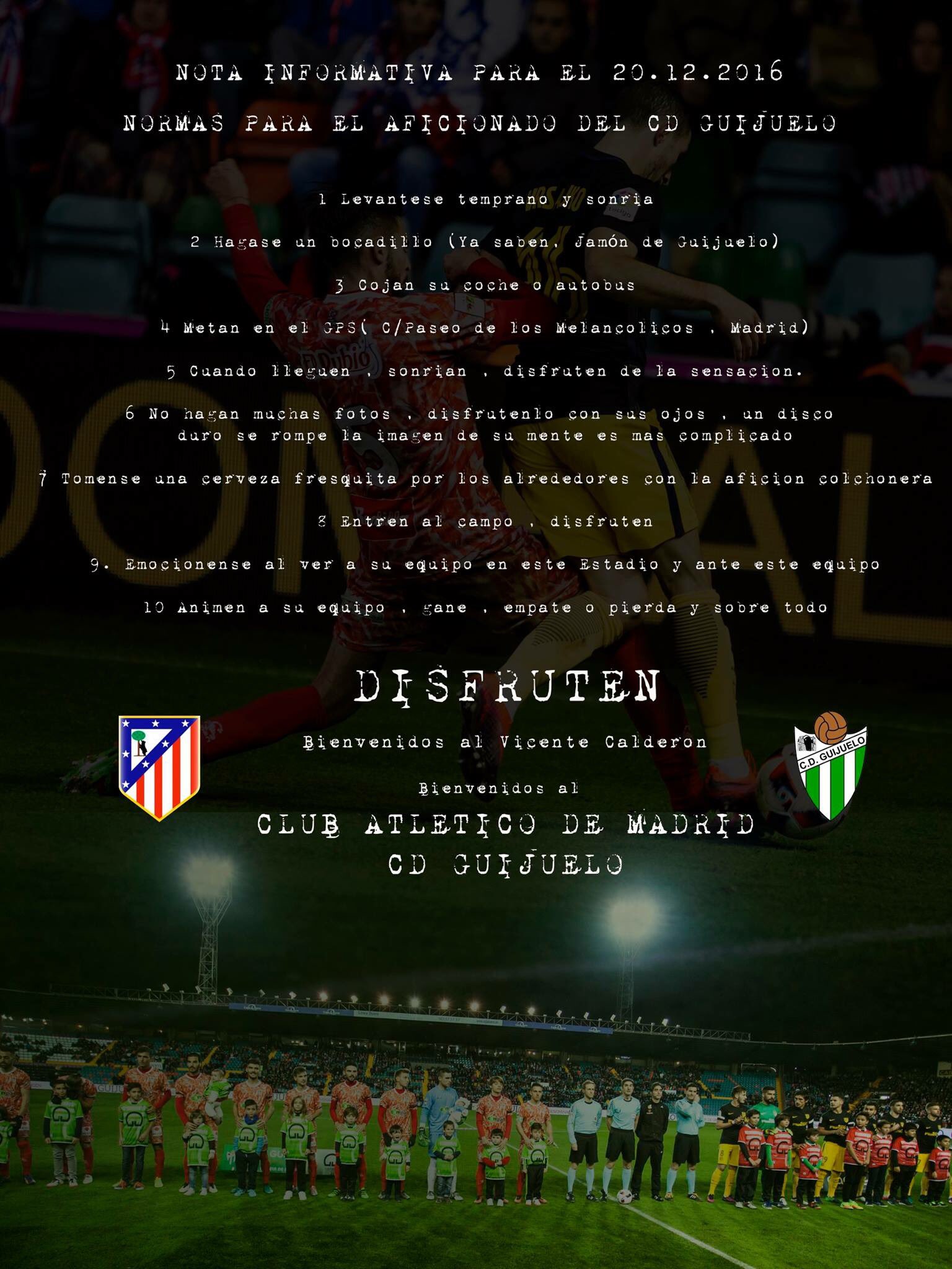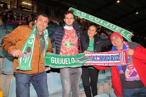 En las gradas se espera la presencia de cerca de un millar de aficionados guijuelenses. Tras la respuesta masiva en el Helmántico, el apoyo en Madrid será menor, pero igualmente considerable. El club ofreció viaje en autobús y entrada por 25 euros, un precio muy atractivo que ha conseguido llenar cuatro autobuses que viajarán a Madrid a partir de las 16:00 horas. Desde la directiva del club, tras agradecer el buen comportamiento en el estadio salmantino, ha publicado un cartel invitando a la hinchada a que disfrute del partido en el Calderón.