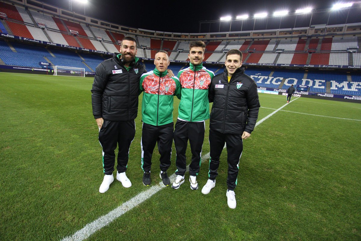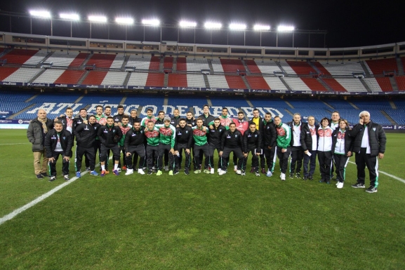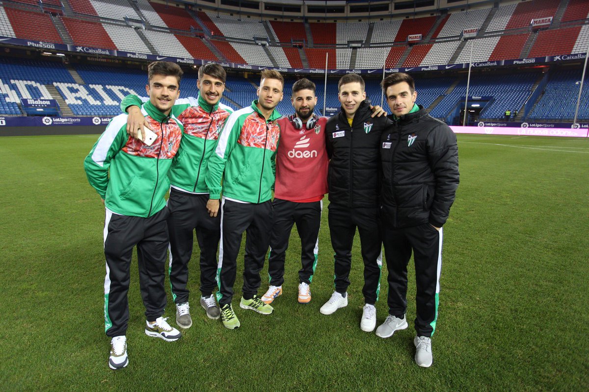 El CD Guijuelo ya pisa el césped del Vicente Calderón y está listo para comenzar el encuentro frente al Atlético de Madrid. Los aficionados verdiblancos ya van llegando a las gradas para vivir una noche inolvidable en un estadio de Primera.