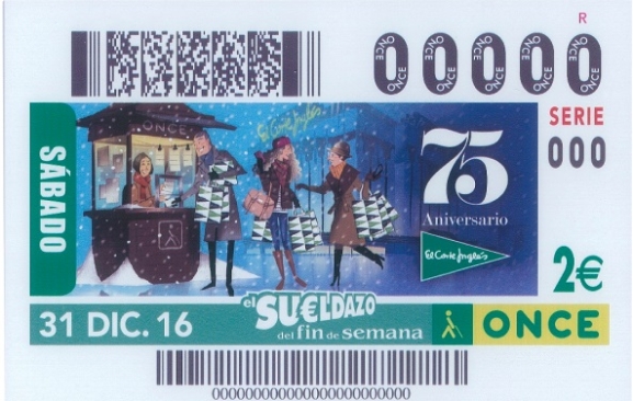 La ONCE dedica el cupón del último día del año al 75 aniversario de El Corte Inglés. Se trata del boleto correspondiente al próximo 31 de diciembre, del que se emitirán cinco millones y medio de cupones que reconocerán y difundirán esta efeméride, y que supone el broche de oro a la celebración de estos 75 años de historia de los grandes almacenes. Este cupón sirve para unir a dos instituciones, El Corte Inglés y la ONCE, que han tenido un papel destacado en la historia moderna de España.