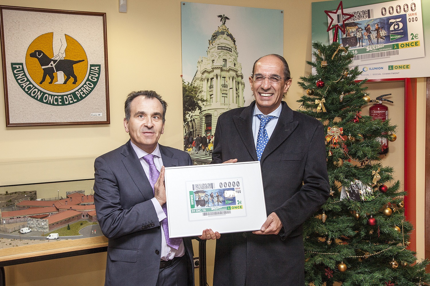 El delegado territorial de la ONCE en Madrid, Luis Natalio Royo Paz, ha entregado al director de Comunicación y Relaciones Institucionales de El Corte Inglés, José Luis González Besada, una copia enmarcada de este cupón tras el transcurso de una visita a la Fundación del Perro Guía de la ONCE.