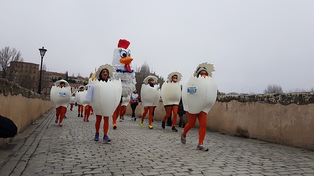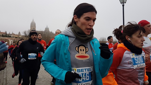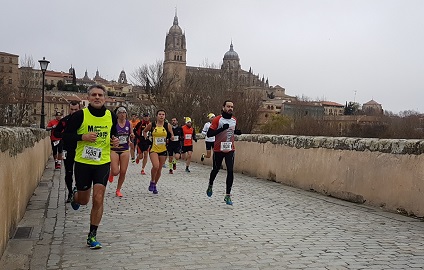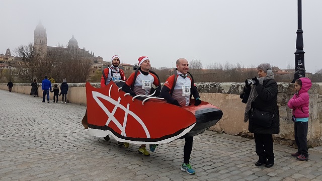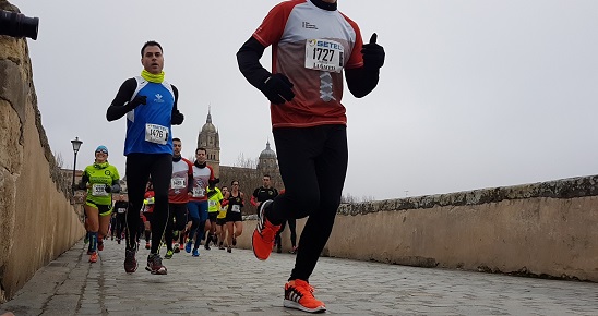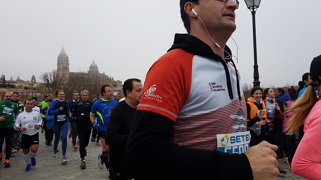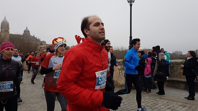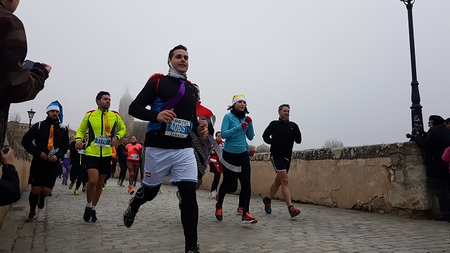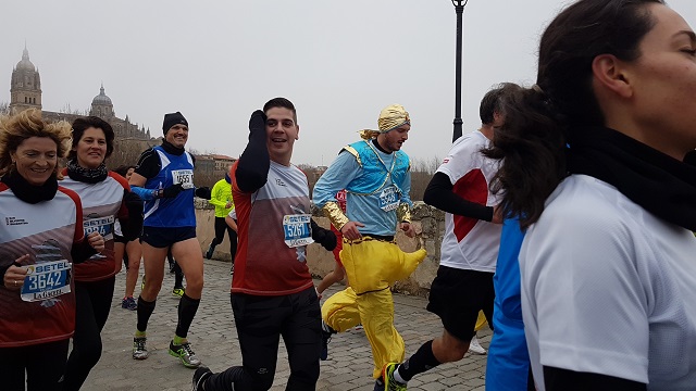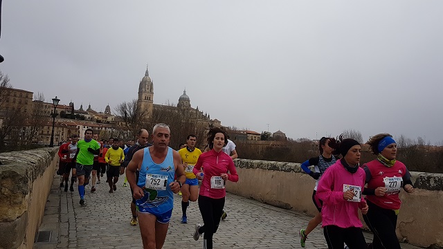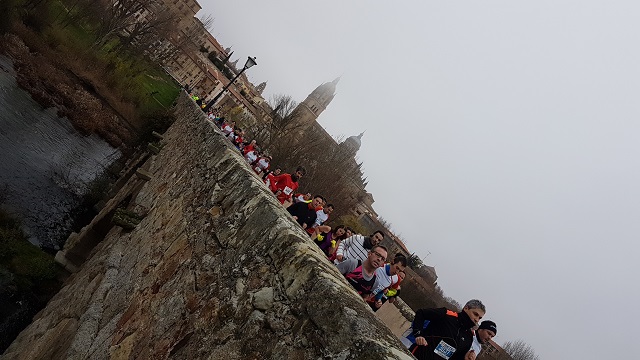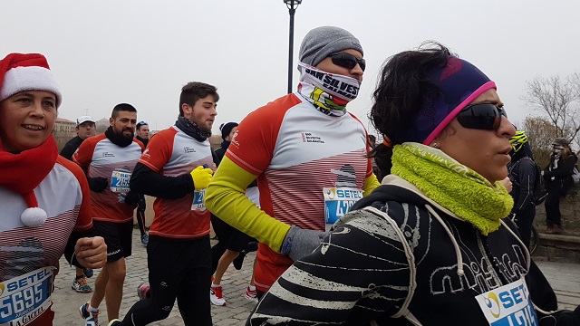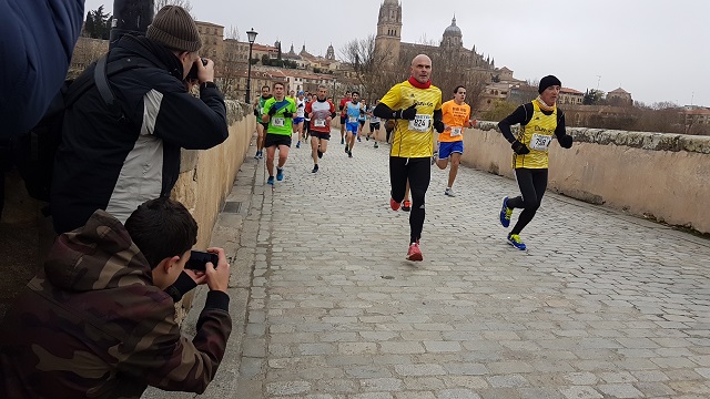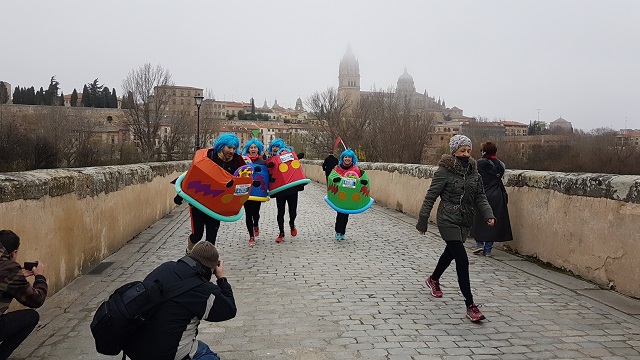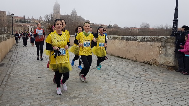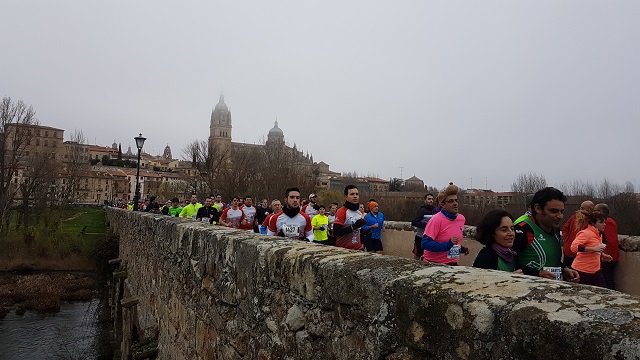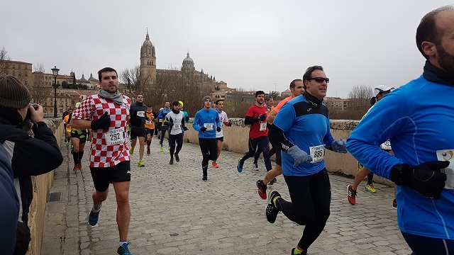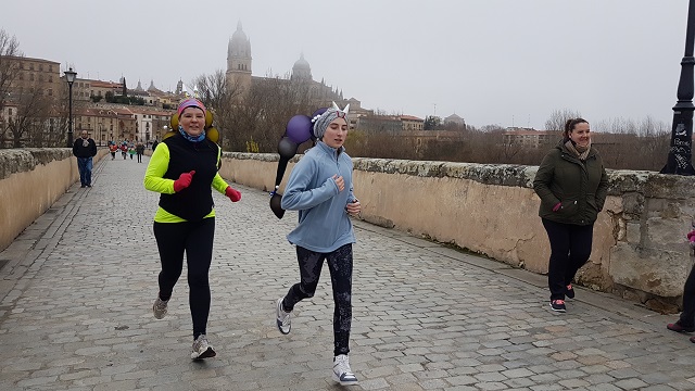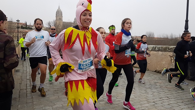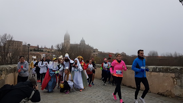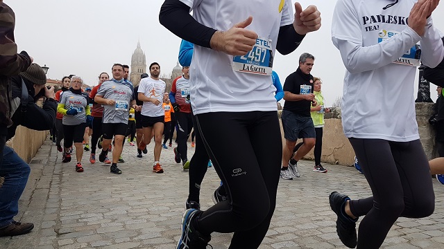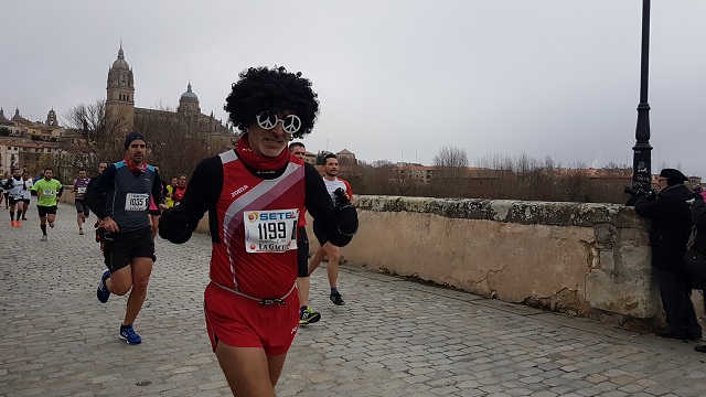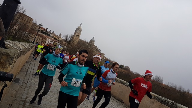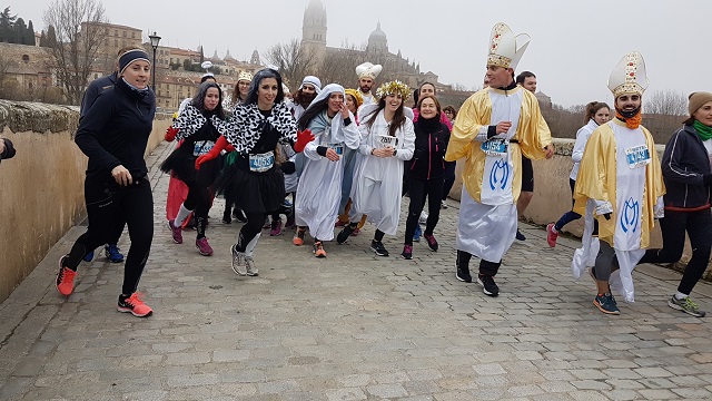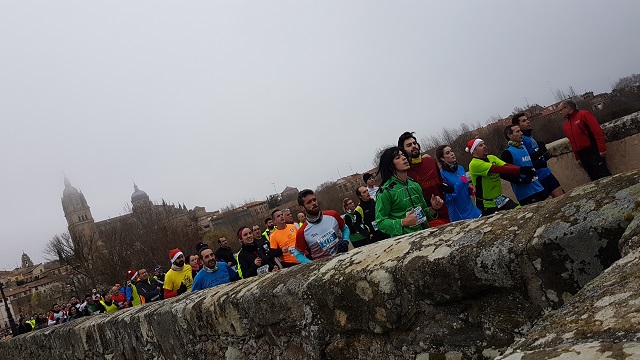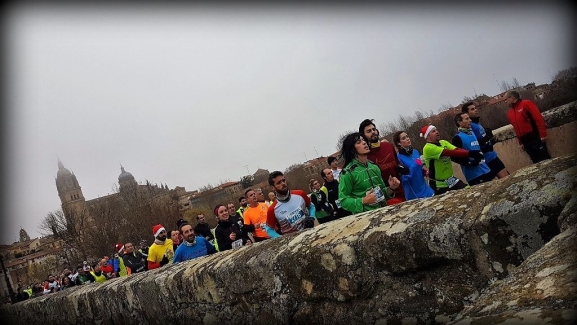 La San Silvestre salmantina deja siempre bellas estampas por la ciudad, especialmente en el casco histórico. Uno de los puntos más interesantes para apreciar esta hilera de corredores es el Puente Romano con las catedrales al fondo. Ángeles Rebollo ha recogido el momento en el que pasaba el grueso del 'pelotón' multicolor, en el que se aprecia la alegría y el ambiente festivo de la carrera.