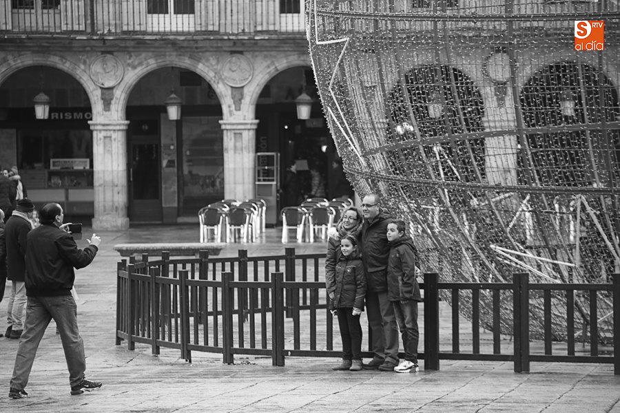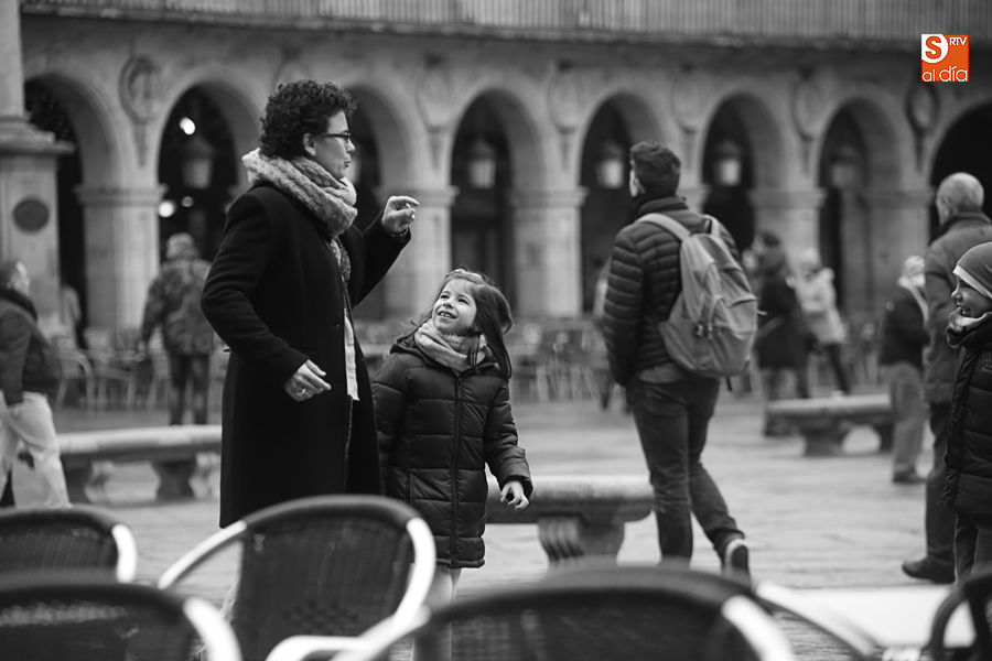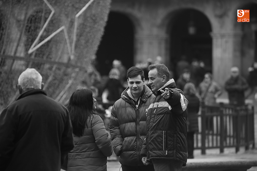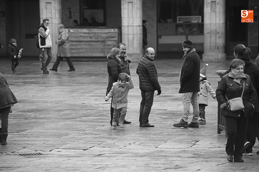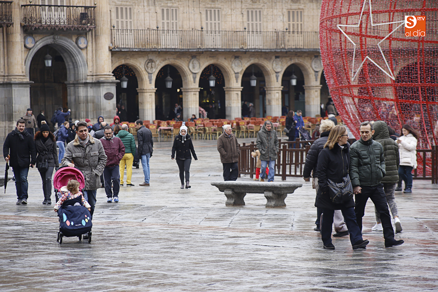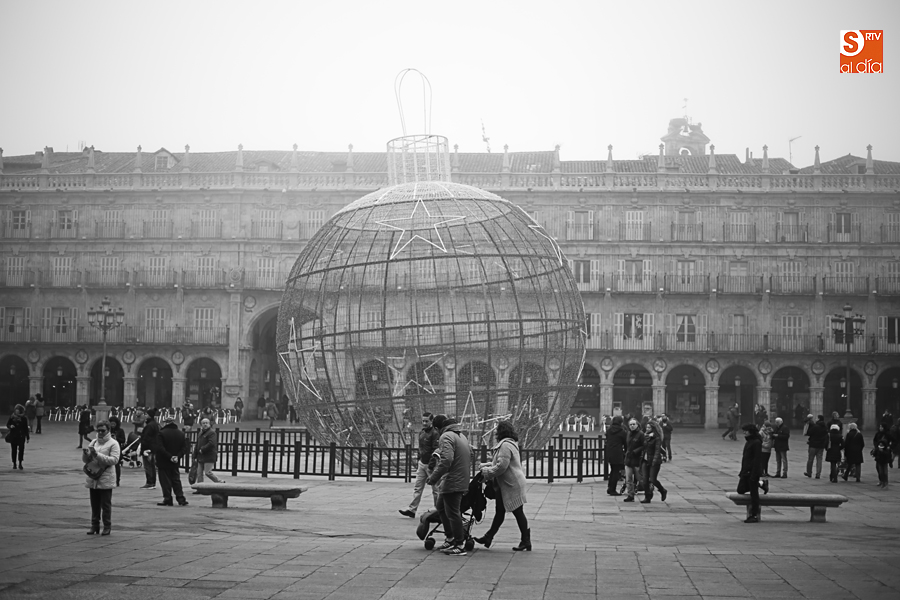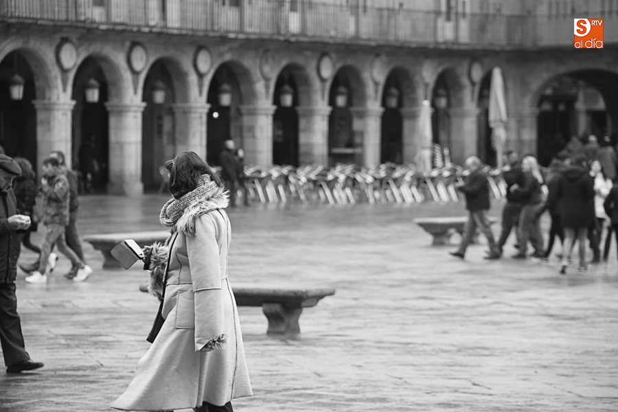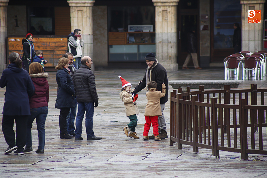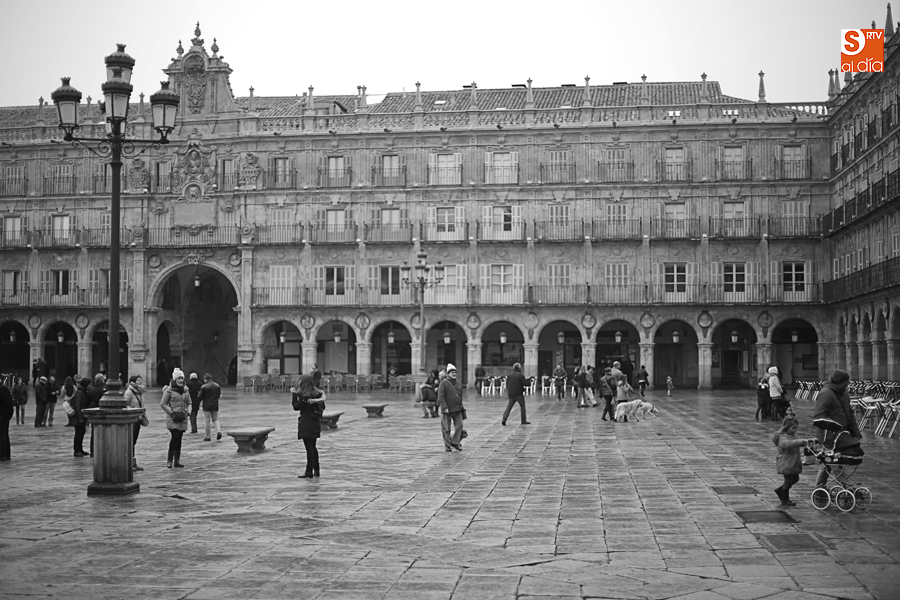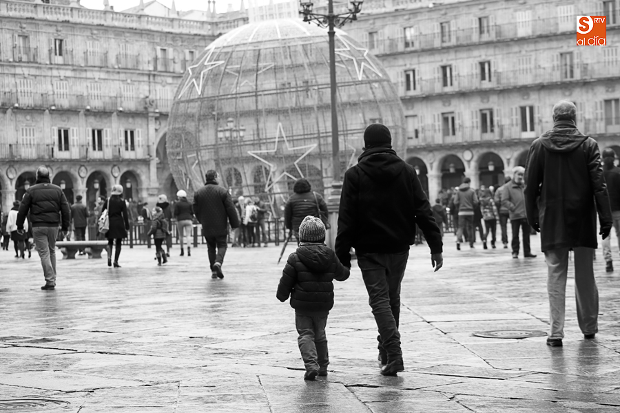 En la mañana de Navidad Salamanca tiene un encanto especial. Parece haberse detenido el tiempo. Envuelta en niebla, la ciudad luce sus eternos encantos. Familias de paseo, curiosos, despistados y algún joven trasnochador en este paisaje en el corazón del casco histórico salmantino.
