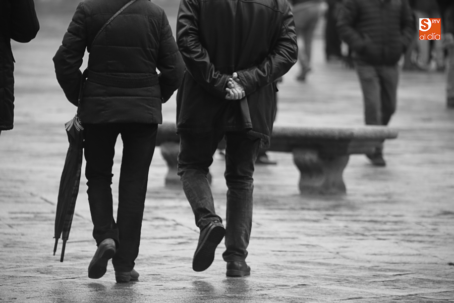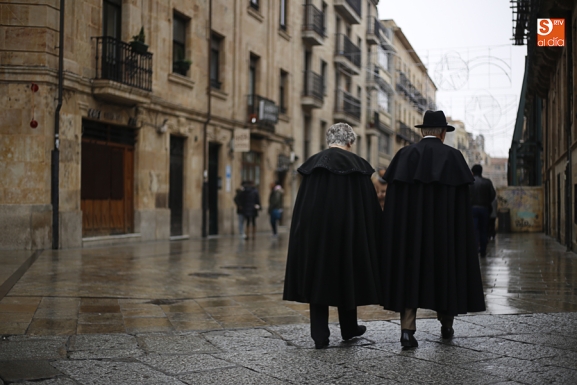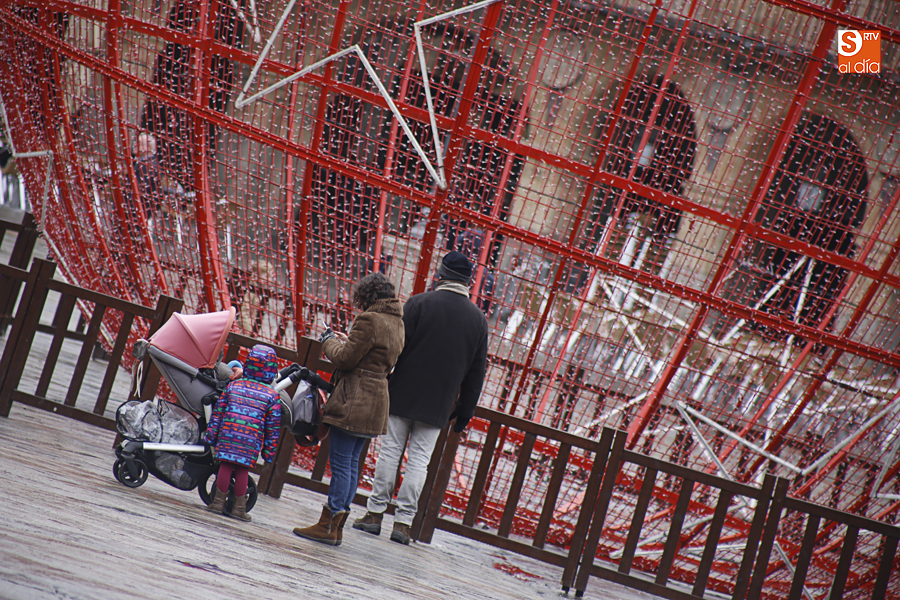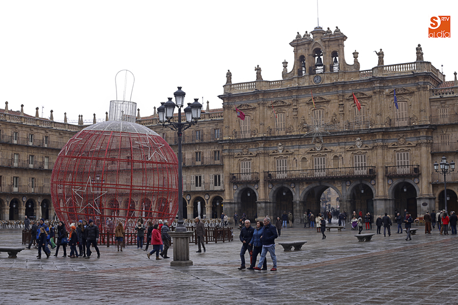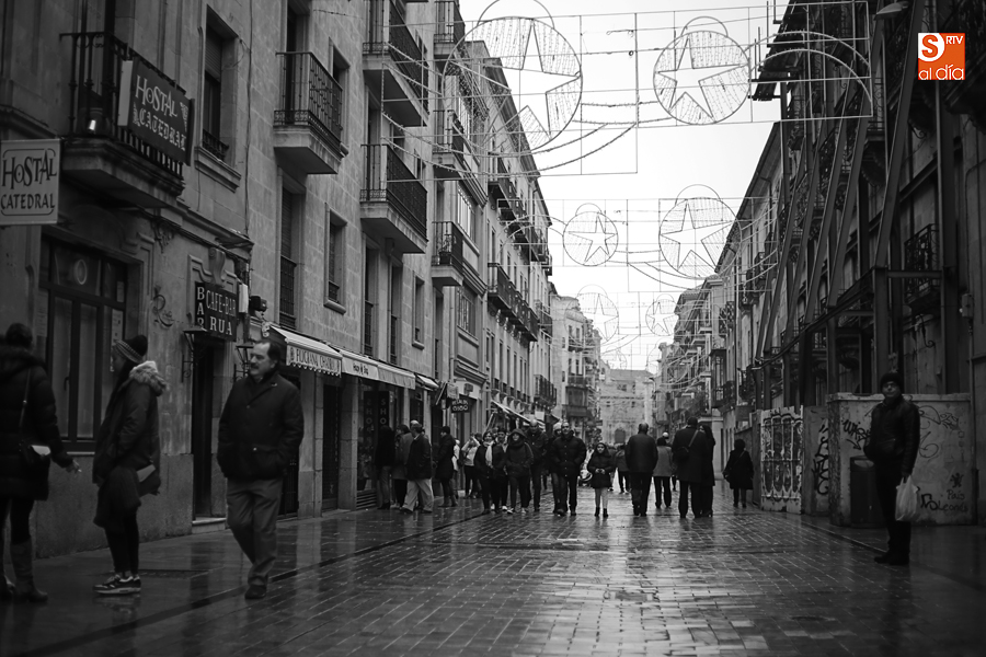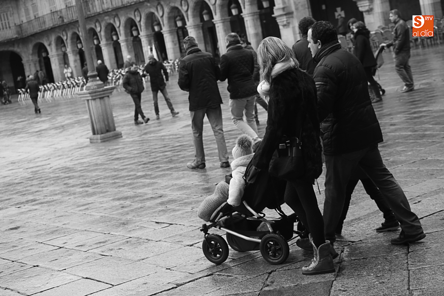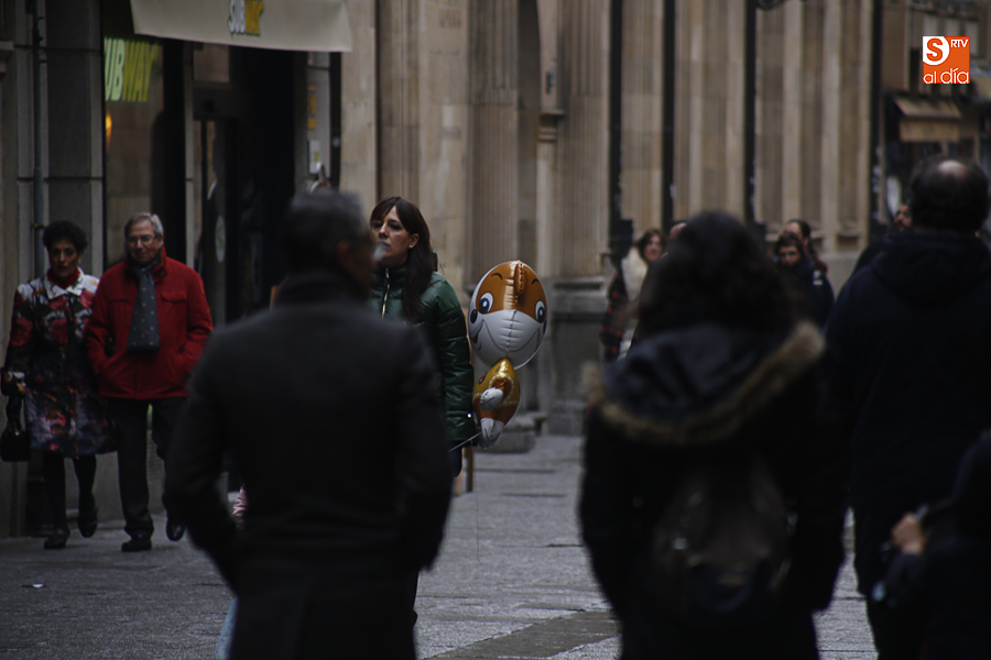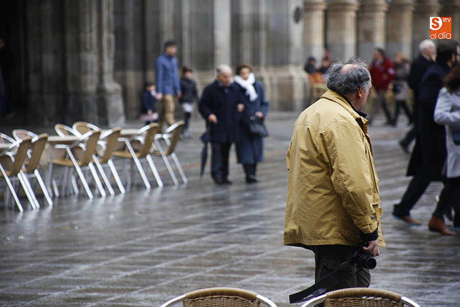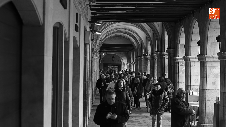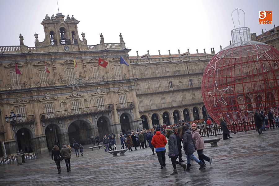 En la mañana de Navidad Salamanca tiene un encanto especial. Parece haberse detenido el tiempo. Envuelta en niebla, la ciudad luce sus eternos encantos. Familias de paseo, curiosos, despistados y algún joven trasnochador en este paisaje en el corazón del casco histórico salmantino.