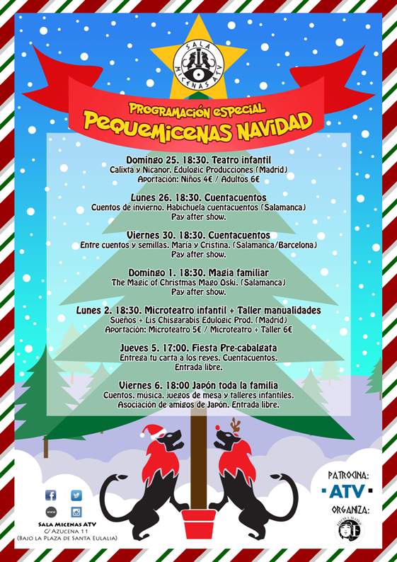 El día 5 de enero, el día más especial del año para los niños, podrán acudir a la Sala Micenas-ATV a partir de las 17 de la tarde a dar su carta, antes de la cabalgata, a los pajes de los Reyes Magos y a escuchar algunos cuentos navideños.