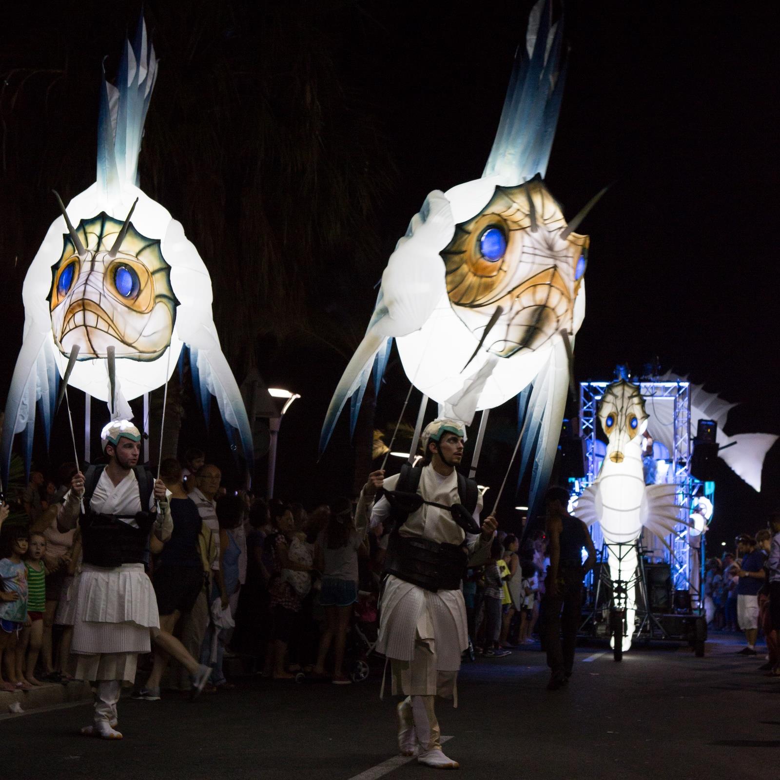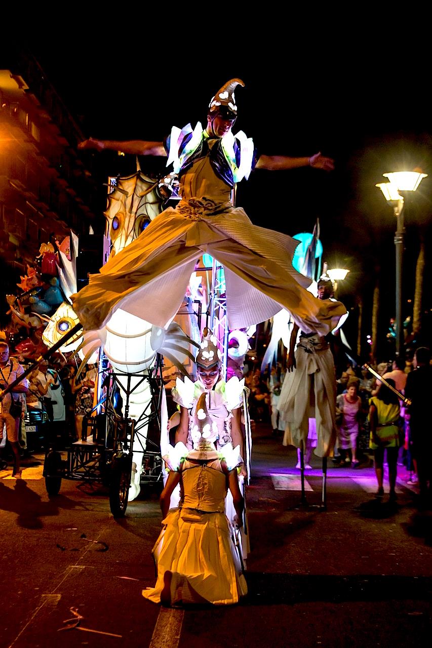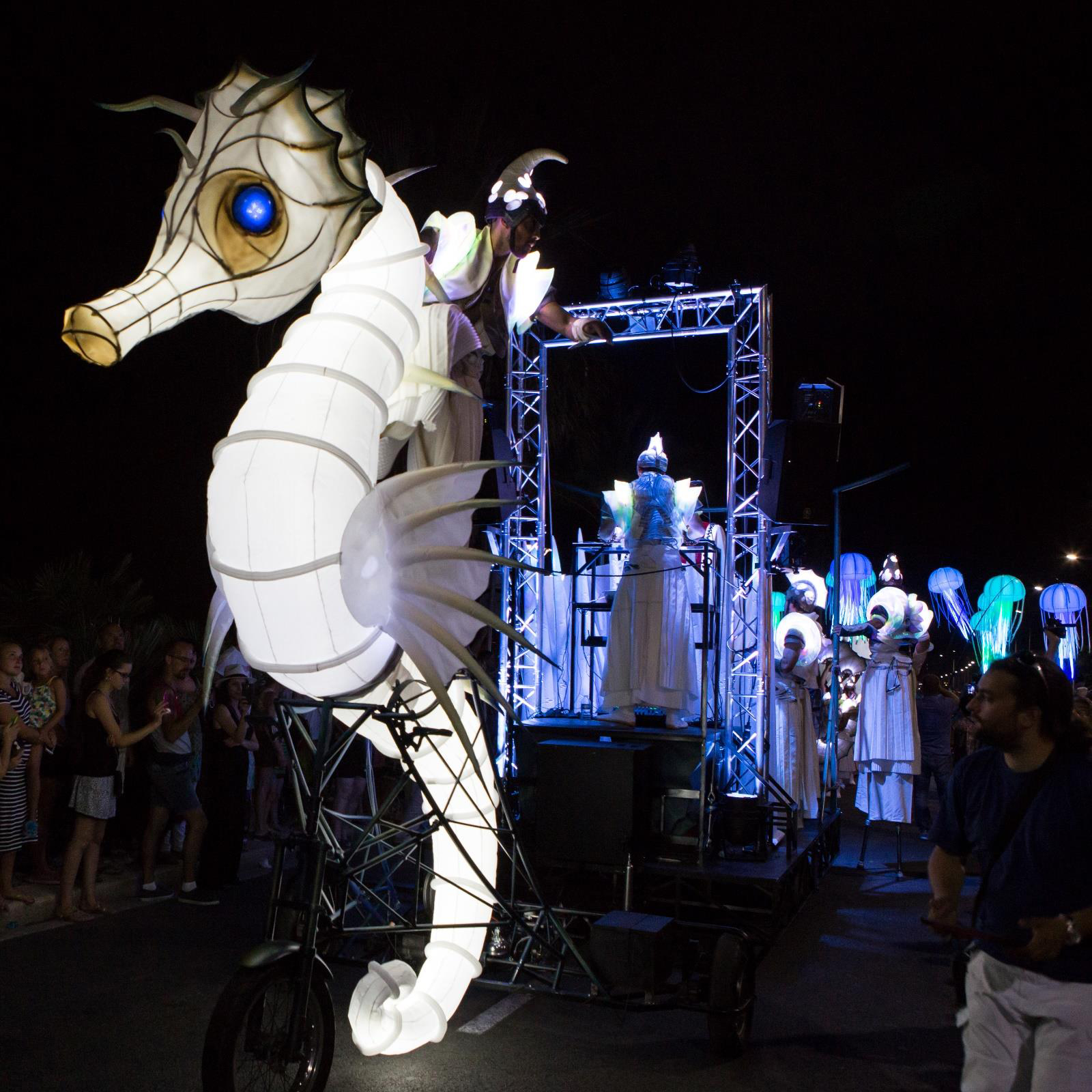 Junto a los tronos reales y las carrozas irán 26 actores interpretando un gran espectáculo inspirado en el mar, Abysses. Un impresionante cortejo de luz avanza en la noche, llevado por el ritmo de Taikos y sonidos electro. Una medusa Vía Láctea, las estrellas que brillan, un caballito de mar majestuoso, acompañado por zancudos. El Señor del Mar orgulloso de conducir el carro de los Océanos. Peces como las estrellas, incluso más desmesurados, titiriteros audaces vienen a cerrar este mosaico.