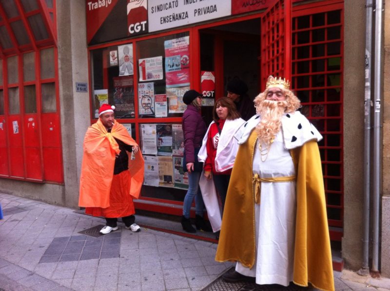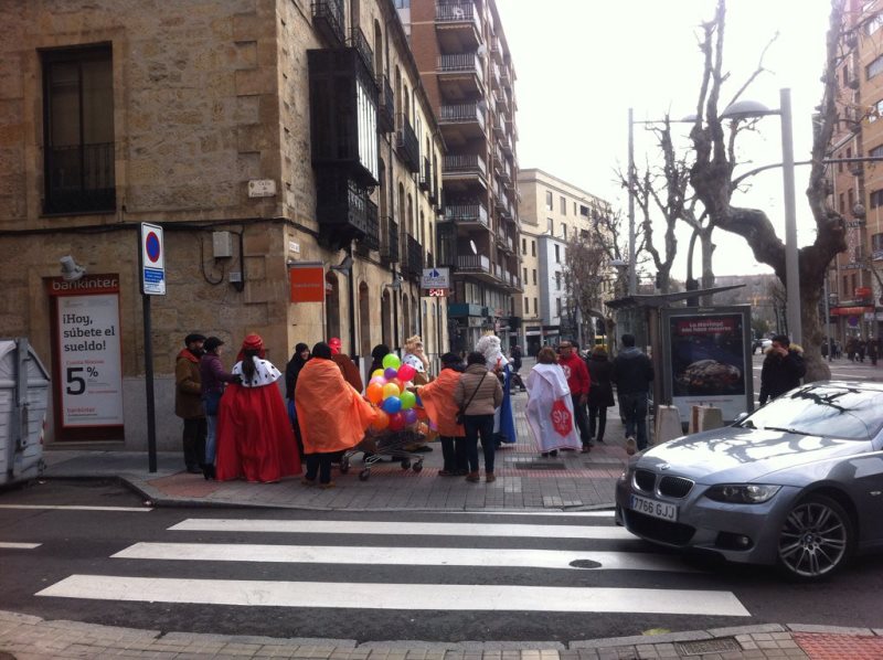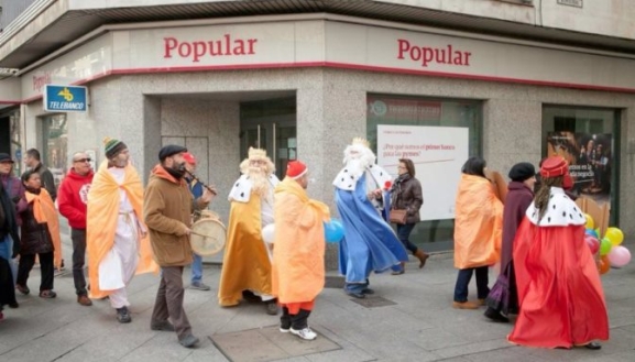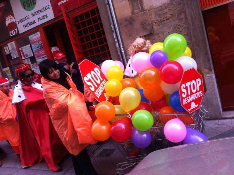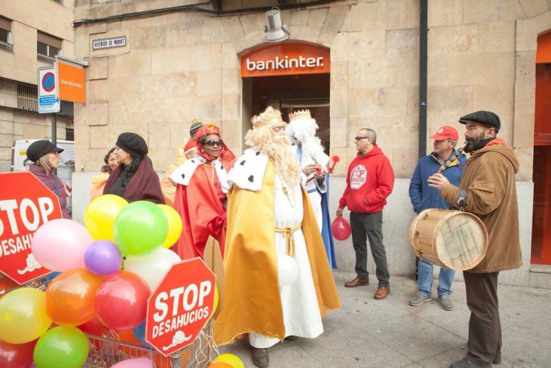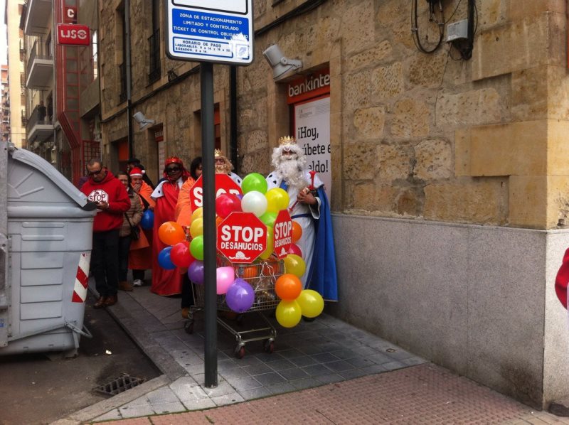 La Plataforma Stop Desahucios Salamanca ha organizado este jueves el recorrido 'los Reyes Magos Desahuciados' y junto a sus majestades, con el fin de repartir carbón por algunas entidades bancarias de la ciudad, además del Ayuntamiento y la Diputación.