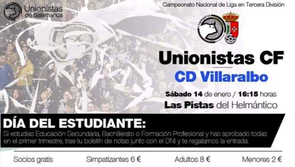 Unionistas CF regresa a las Pistas tras más de un mes de parón liguero. El encuentro, que se celebrará el próximo sábado a partir de las 16.15 horas, ha sido declarado como "Día del Estudiante". Todos aquellos alumnos que en sus estudios de Educación Secundaria Obligatoria, Bachillerato o Formación Profesional hayan aprobado todas sus asignaturas del primer trimestre serán recompensados con una entrada de forma totalmente gratuita. Para el resto de aficionados, los precios serán los habituales: