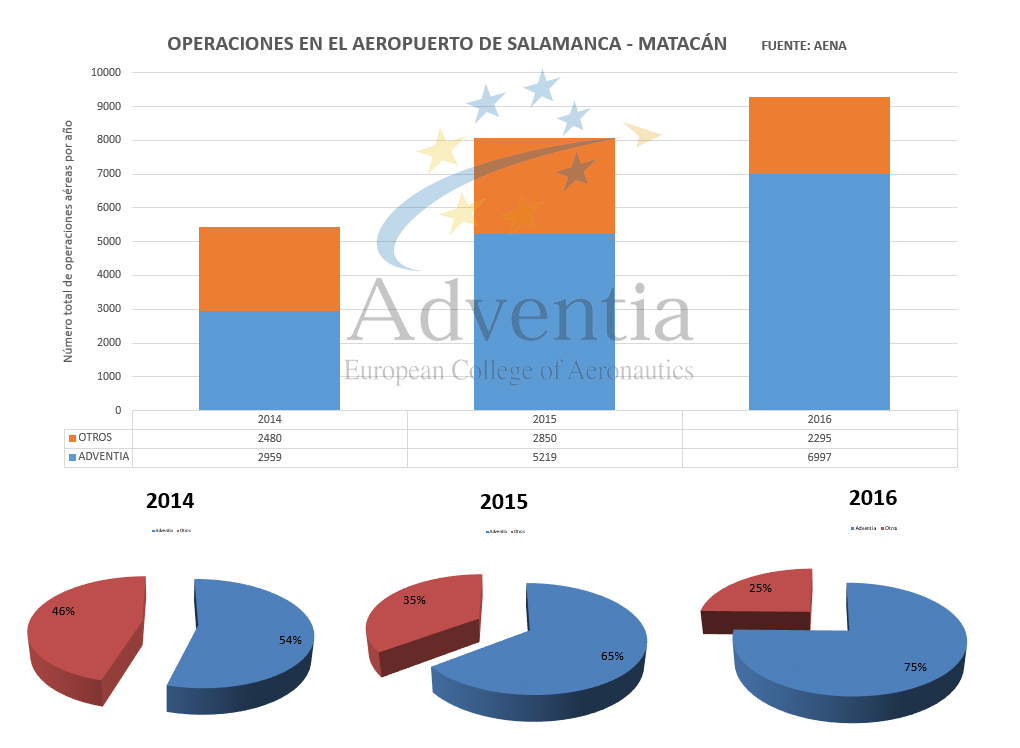 En los últimos años, Adventia ha tenido un impulso en su gestión en aras de potenciar la Escuela en un crecimiento de alumnos importante, con un incremento de su flota y con la creación de puestos de trabajo cualificados en el propio aeropuerto. De este modo, Salamanca, tiene el mayor número de trabajadores de Castilla y León en la zona aeroportuaria, donde también operan otras empresas de trabajos aéreos especializados.