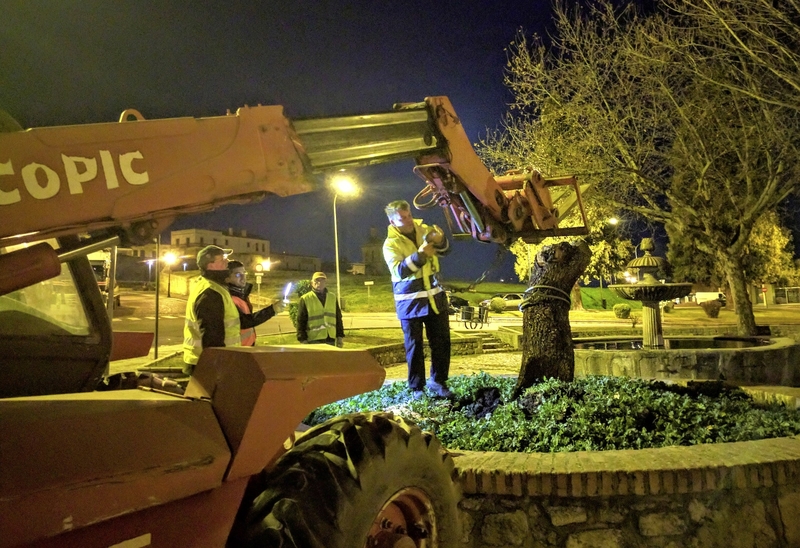 En la mañana del jueves se procedió a talar toda la parte superior de la encina, quedando únicamente la parte inferior del tronco, que fue extraído en torno a las 7.40 horas de la mañana del viernes, cuando ni siquiera había amanecido.