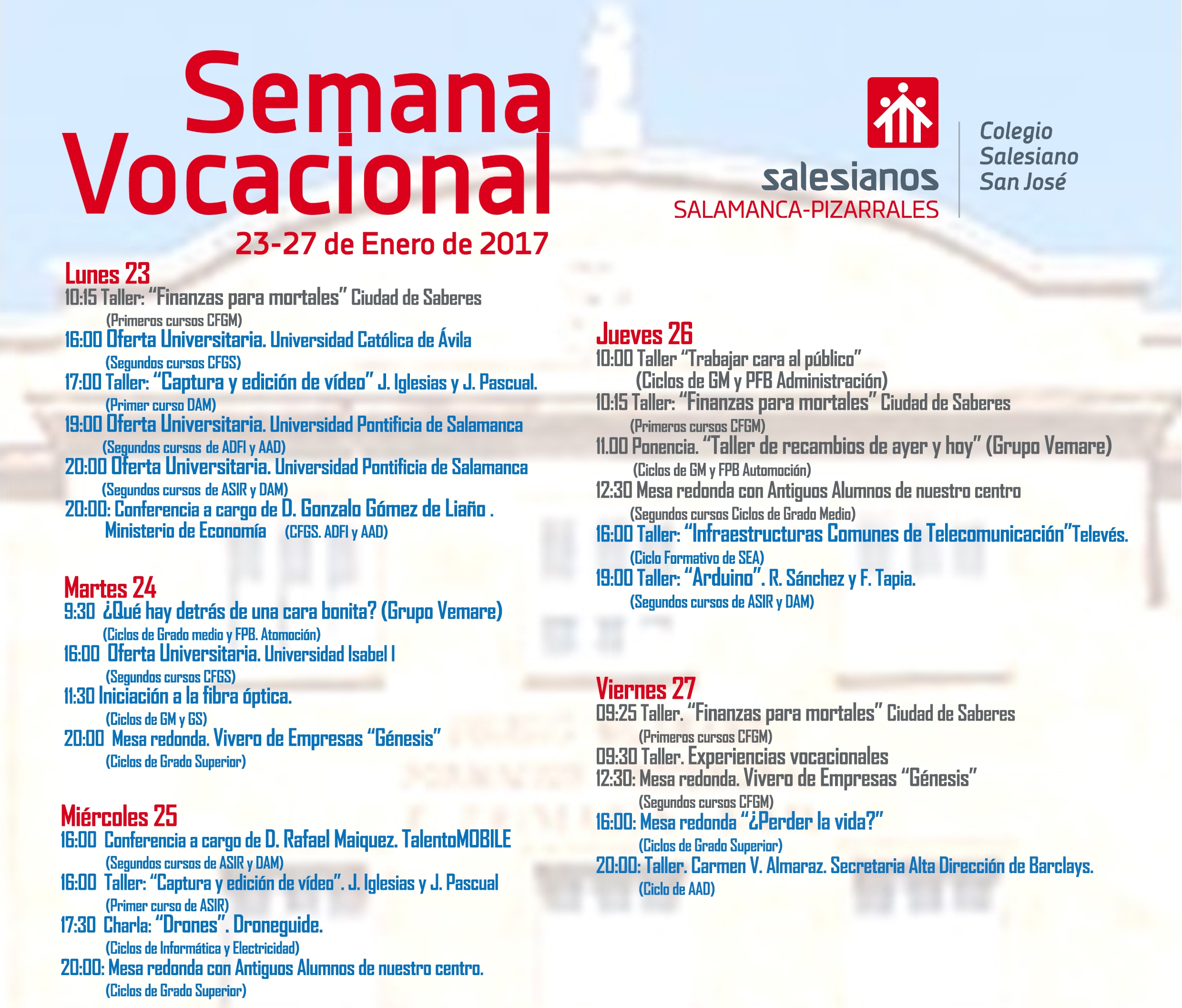 El Colegio Salesiano de Pizarrales, con motivo de la celebración del día de su fundador San Juan Bosco el 31 de enero, celebra su "Semana Vocacional" dando la oportunidad a sus alumnos de ser formados por profesionales de todas las titulaciones de Formación Profesional que se imparten en este centro.