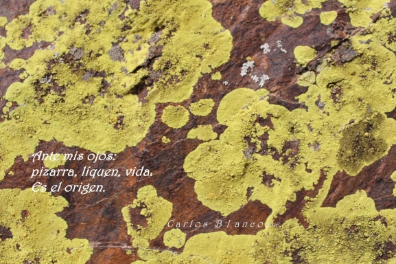 El paisaje se abre como las alas del milano real que me sobrevuela. Tomo asiento sobre la hierba junto a una roca de pizarra. Me acerco mirándola con ojos que considero de buen observador y en ella descubro "pequeñas maravillas" que el paso del tiempo se ha encargado de dibujar con tizas de múltiples colores, en este caso doradas.
