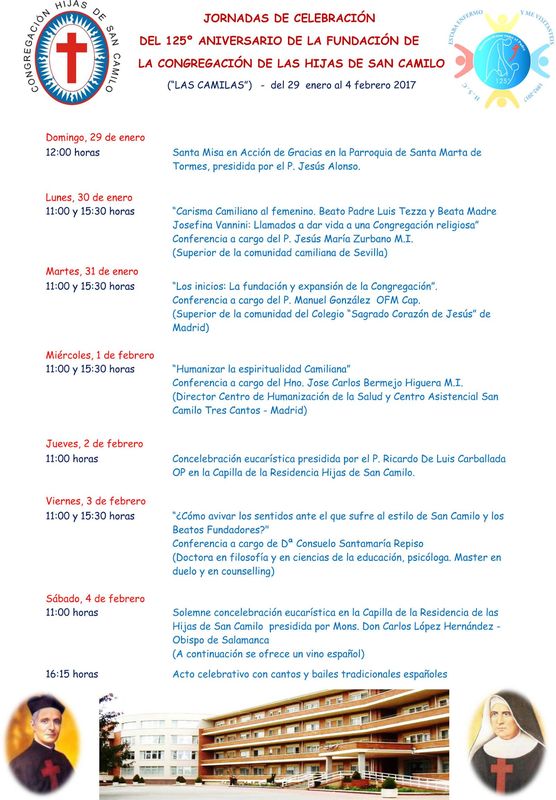 Con motivo del 125º aniversario de la Congregación, las Hijas de San Camilo han organizado algunos actos religiosos y culturales durante los días 29 de enero a 4 de febrero. Desde un punto de vista informativo y de difusión de la propia espiritualidad, varias personalidades intervendrán en la residencia sobre temas como el carisma camiliano en su dimensión femenina, la fundación y expansión de la Congregación, la humanización de la espiritualidad camiliana y el acompañamiento a los que sufren según el estilo de San Camilo y los Fundadores de las Hijas de San Camilo. Desde un punto de vista religioso se celebrarán misas en la parroquia de San Marta de Tormes y en la propia Residencia. Destaca la presencia del Obispo de Salamanca, Don Carlos López Hernández, el día 4 de febrero presidiendo la eucaristía que se celebrará en la misma Residencia.