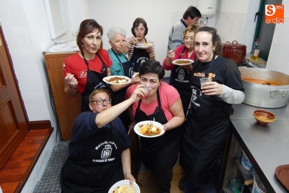 Y al buen hacer de los mataceros hay que sumar el de las matanceras que, entre fogones y con los pucheros y cazuelas preparadas, se afanan en preparar los menús que se sirven en la cena del sábado y en la comida del domingo, en una jornada solidaria con la recogida de donativos y alimentos no perecederos para el Banco de Alimentos de Salamanca.