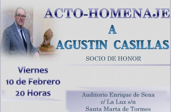 La Asociación Cultural Tierno Galván, en colaboración con el Ayuntamiento de Salamanca, celebrará el viernes, 10 de febrero, un acto homenaje al escultor salmantino Agustín Casillas, socio de honor del colectivo. Será a las ocho de la tarde en el Auditorio Enrique de Sena y contará con la participación de la diseñadora Fely Campo, el pintor Andrés Alén, la poeta Montse Villar, el profesor Eduardo Sánchez, el escritor José Manuel Regalado y el director del Instituto de las Identidades, Juan Francisco Blanco.