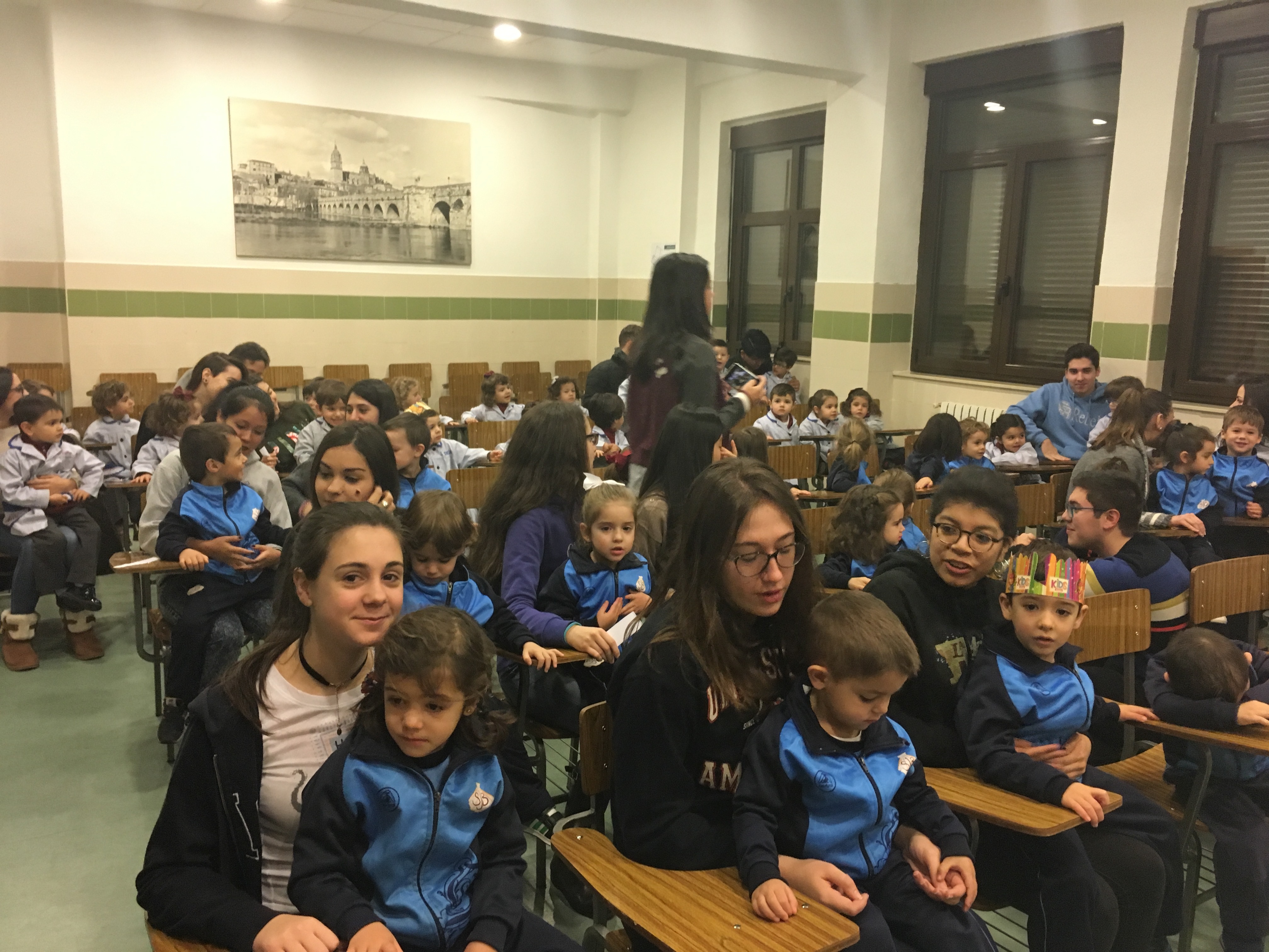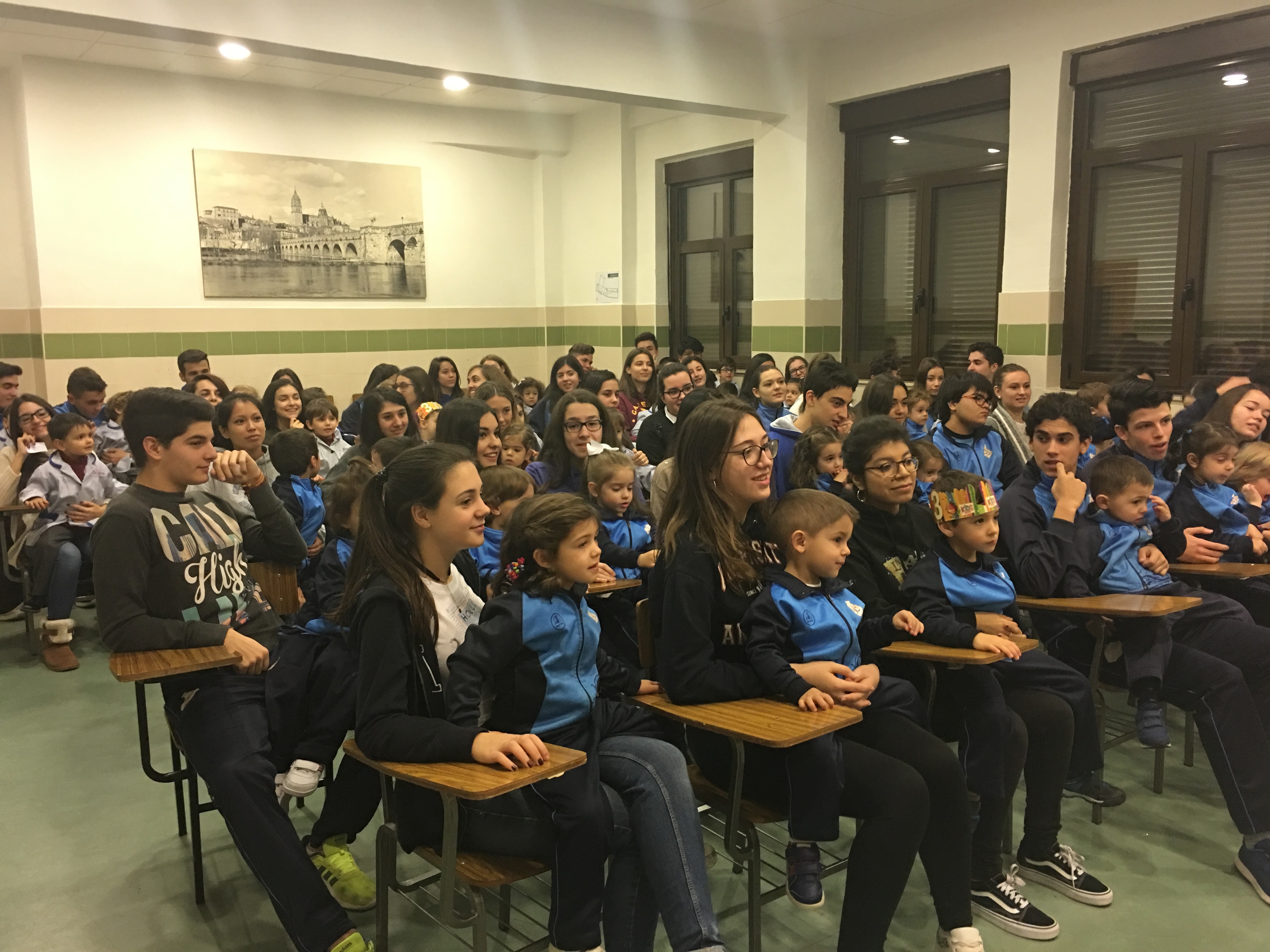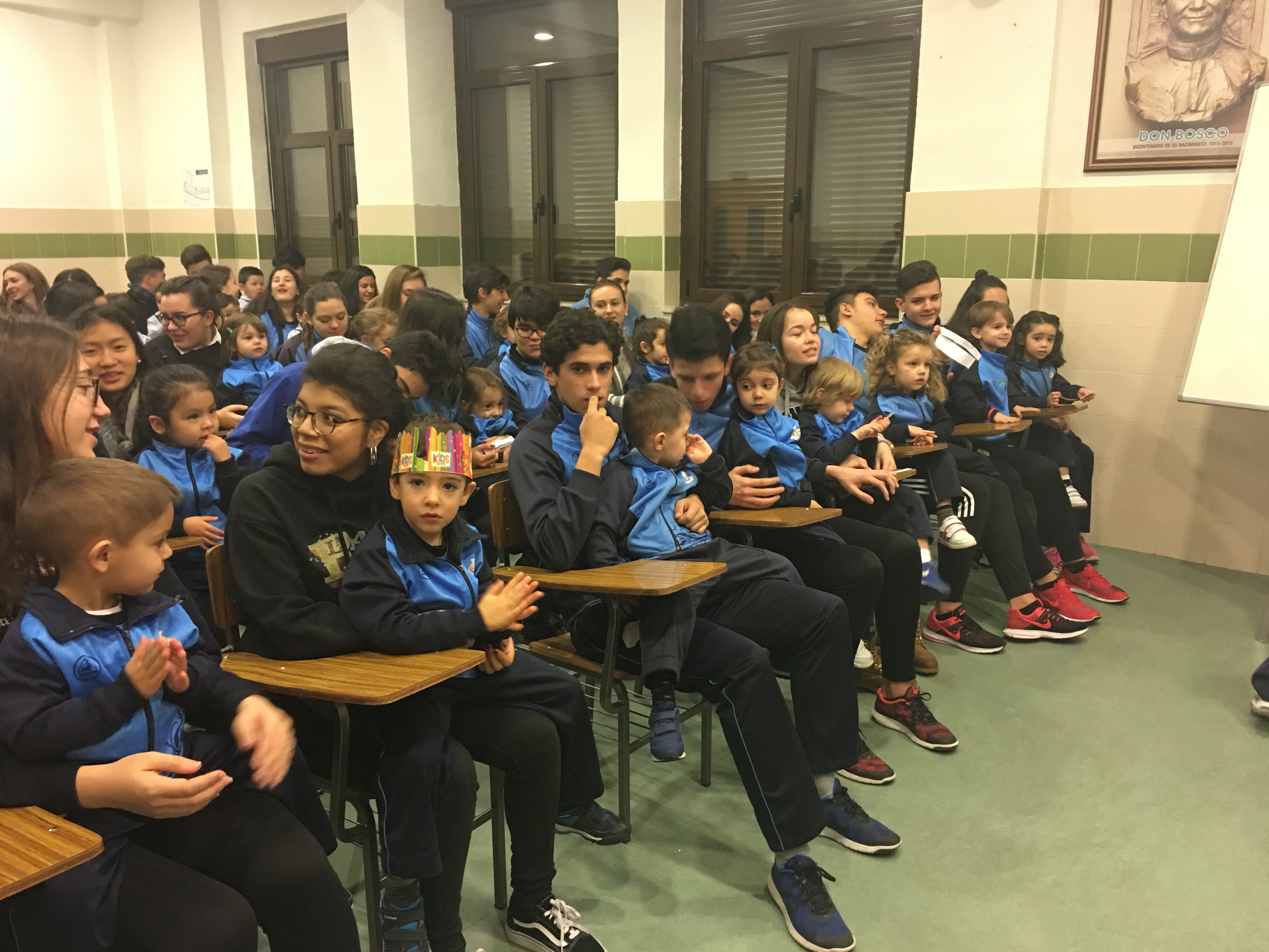 an Juan Bosco acudieron al salón de actos para pasar un agradable rato de convivencia con alumnos de cursos superiores y celebrar un concurso de preguntas y respuestas sobre la vida de Don Bosco.