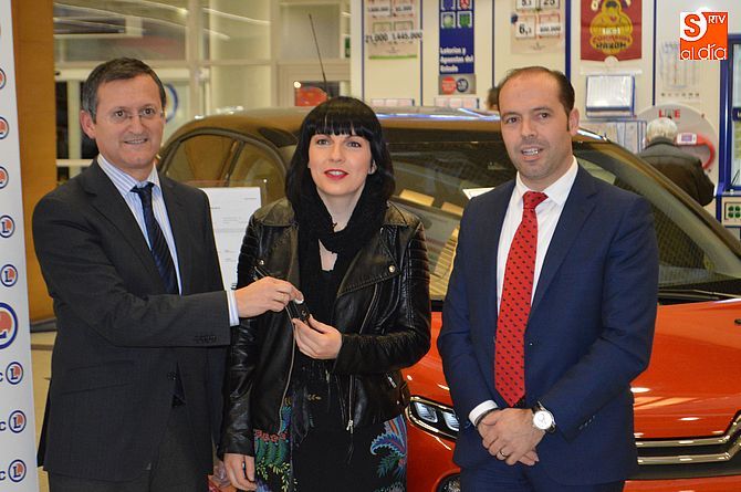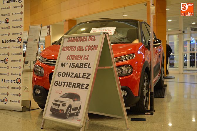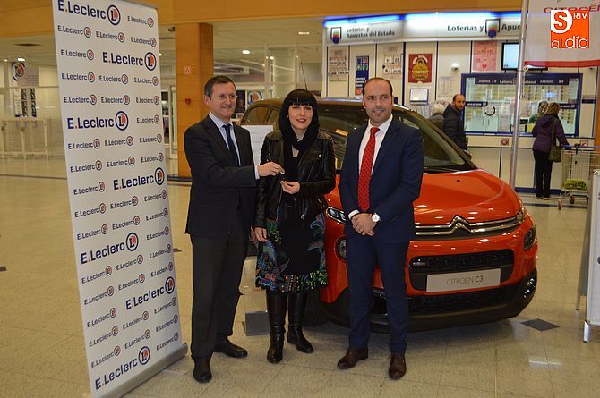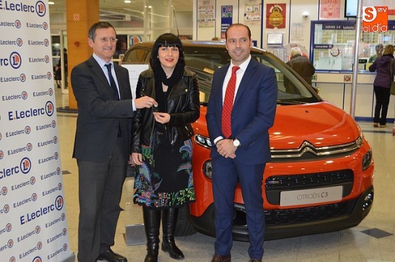 Los responsables de la cadena de supermercados E-Lecrerc y concesionario Grupo Nani de Citroën en Salamanca Enrique Sáez y Rubén Hernández respectivamente, hicieron entrega de un vehículo marca y modelo Citroën C3 a la ganadora del sorteo que ha realizado la marca de supermercados entre sus clientes por las compras en su gasolinera.