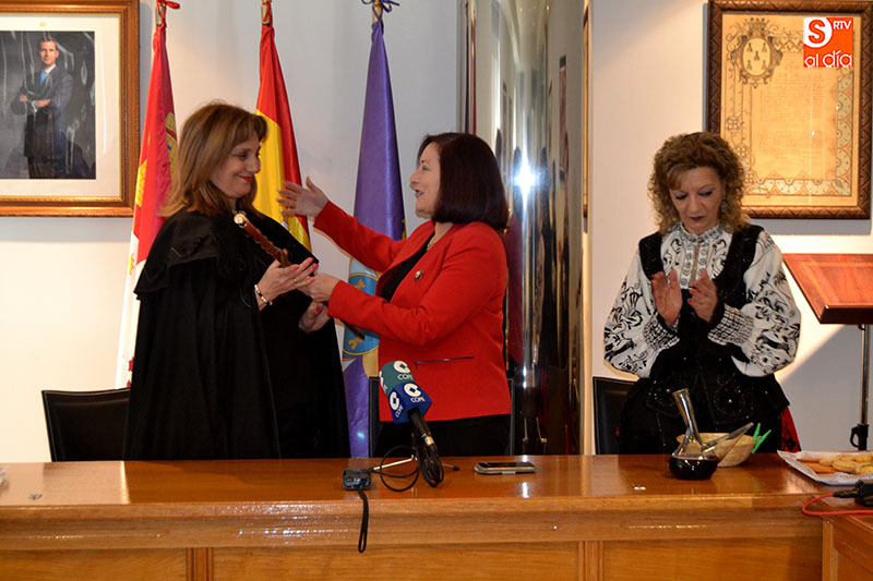 La alcaldesa, Carmen Ávila, entregaba el bastón de mando a la aguedera mayor, María Teresa Albarrán