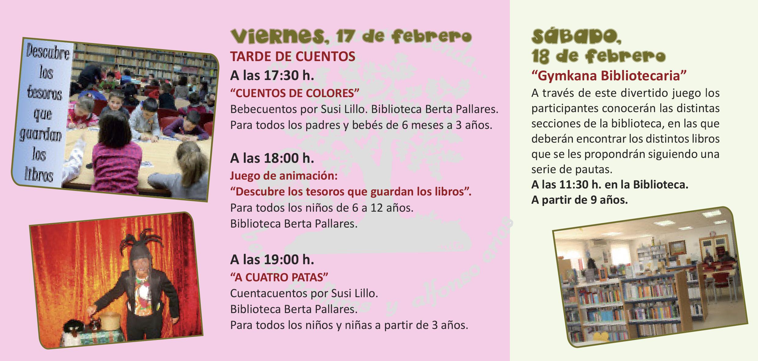 Para el viernes, 17 de febrero, se ha programado un completa tarde de cuentos, que comenzará con el bebecuentos 'Cuentos de colores', de Susi Lillo, dirigido a bebés de seis meses a tres años, al que seguirá el juego de animación 'Descubre los tesoros que guardan los libros'. La tarde finalizará con el cuentacuentos 'A cuatro patas' para todos los niños y niñas a partir de 3 años.