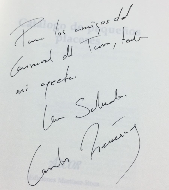 La Asociación Cultural Carnavaldeltoro.es ya ha recibido uno de los regalos estrella de la Cesta del Antruejo que pondrán en juego con el Sorteo de la ONCE del próximo Miércoles de Ceniza: el libro del locutor radiofónico Carlos Herrera El Catálogo de los Pequeños Placeres.