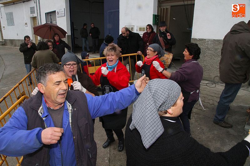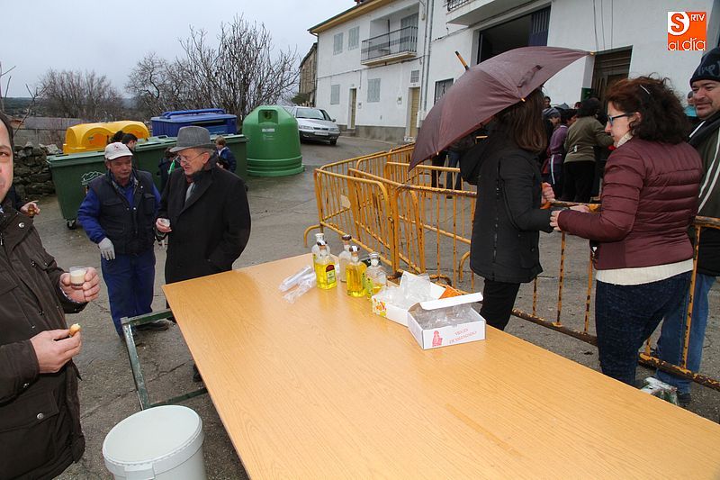Santibáñez de Béjar acogió hoy una nueva edición de su matanza tradicional que tuvo que luchar contra los elementos en un día marcado por la mala meteorología. El sacrificio forma parte del Circuito de Matanzas organizado por la Diputación de Salamanca. Pese a que la lluvia fue intensa durante toda la jornada, las actividades no se suspendieron, aunque tuvieron que ser trasladadas al centro de mayores, en cuyas salas y en el umbral se situó la mesa de despiece y el fuego para preparar las patatas 'machás' con torreznos y chichas para todos los presentes.