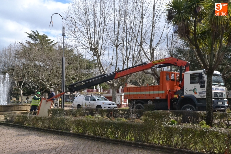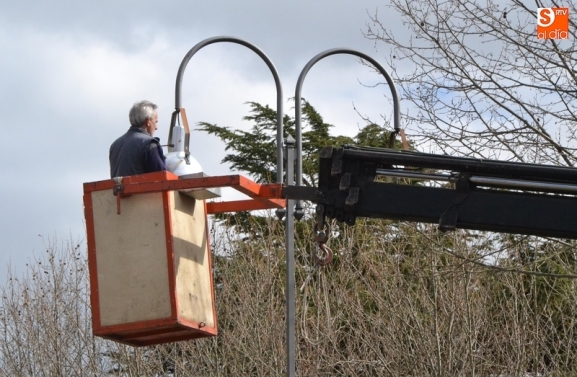 Operarios de la empresa encargada del mantenimiento del alumbrado público en Ciudad Rodrigo, Electricidad Casado, estuvieron trabajando en la mañana del lunes en el Parque de La Glorieta. La intervención se centró en los focos del paseo central del Parque, con el objetivo de ponerlos a punto de cara al 'debut' carnavalero del citado paseo.