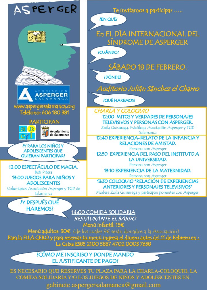 La Asociación Asperger y TGD (trastorno generalizado del desarrollo) de Salamanca celebrará el Día Internacional de las personas con Asperger el próximo sábado con una charla coloquio, a partir de las 12.00 horas, en el Centro Julián Sánchez El Charro. La jornada se completará con una comida solidaria en El Bardo y con actividades infantiles.
