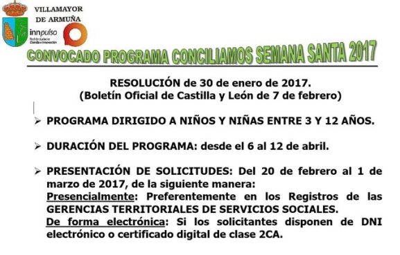 El próximo lunes, 20 de febrero, se abre el plazo de presentación de solicitudes del Programa 'Conciliamos' para el periodo de Semana Santa que en Villamayor se desarrollará del 6 al 12 de abril en el Colegio Piedra de Arte. El programa está dirigido a niños y niñas entre 2 y 12 años y las solicitudes se pueden presentar hasta el 1 de marzo tanto presencialmente (en el registro de la Gerencia Territorial de Servicios Sociales) como de forma electrónica.