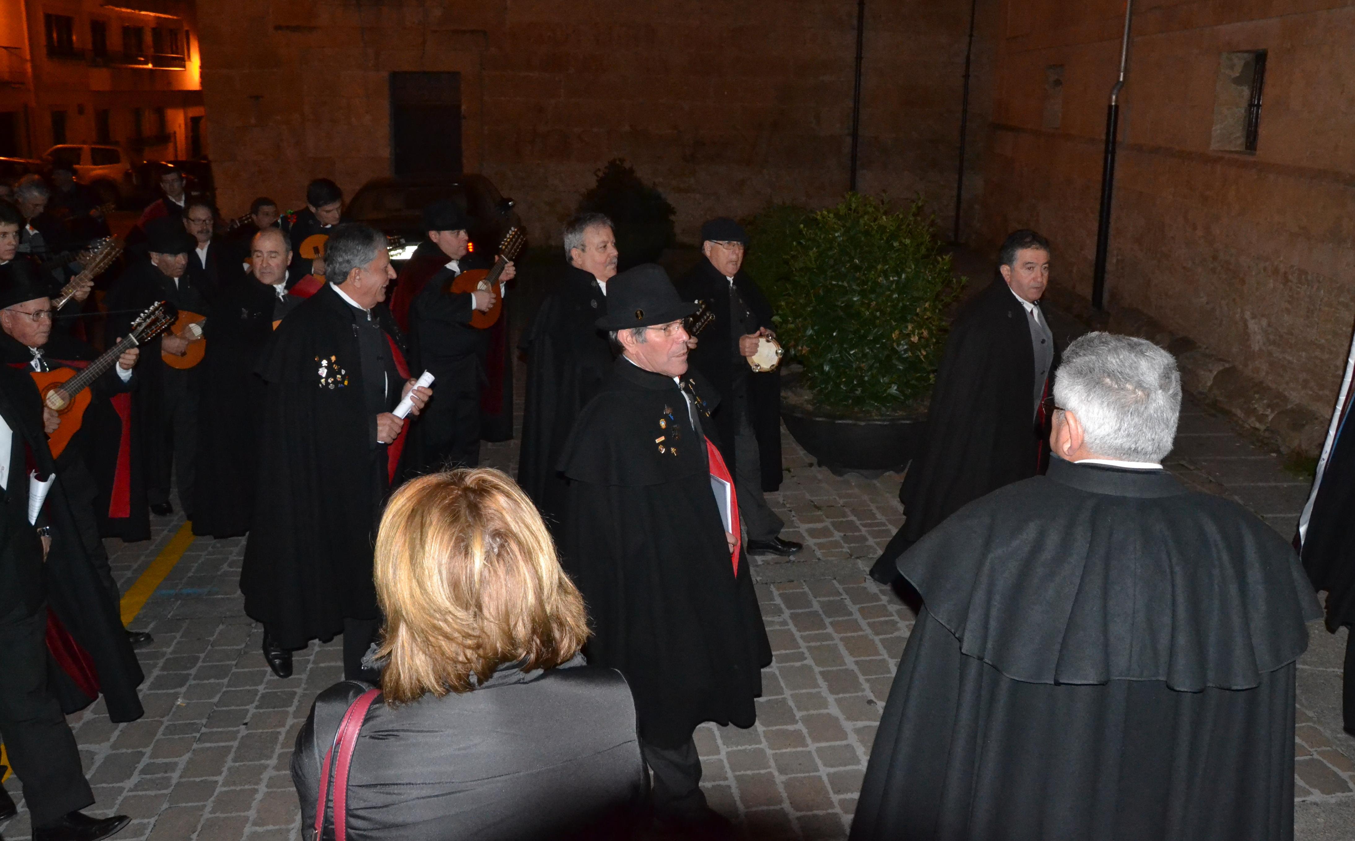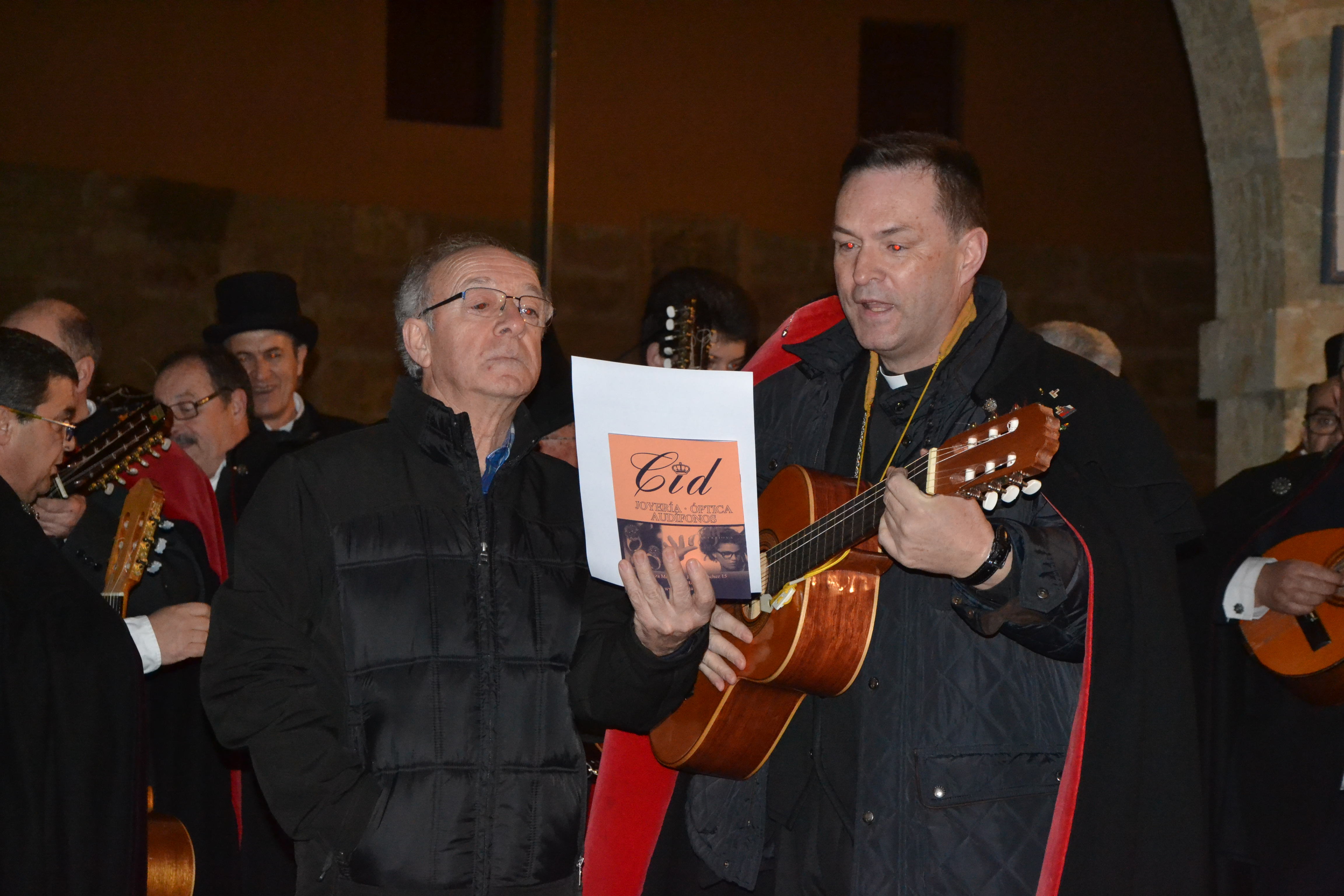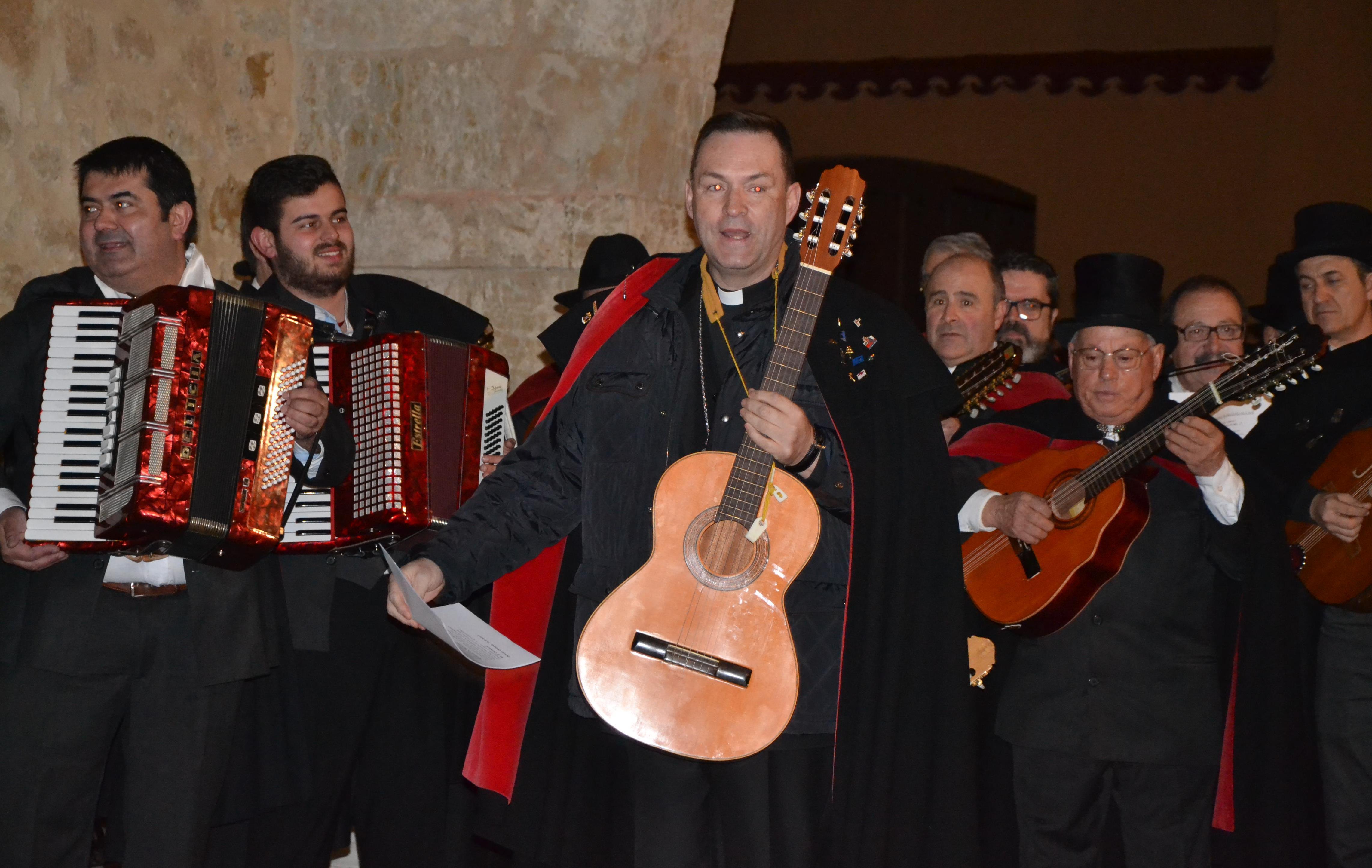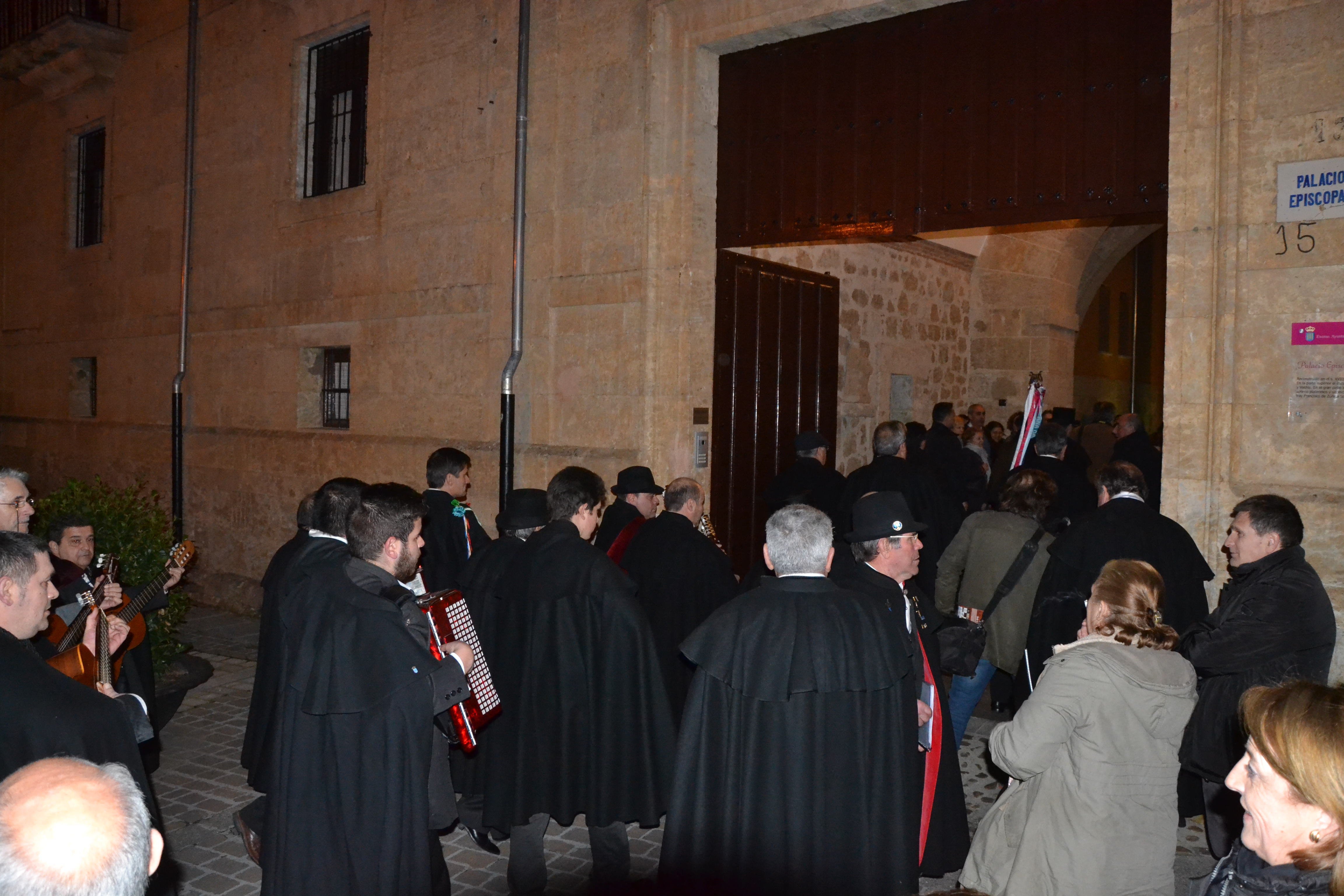 La primera cita de este año fue en el Palacio Episcopal, donde la Rondalla acudió a rondar al Obispo Raúl Berzosa, quién les recibió ?casi literalmente- con la guitarra en la mano, para cantarles a los murguistas una coplilla que él mismo había compuesto ?que se puede escuchar en el vídeo que aparece más abajo- antes de que la propia Rondalla cantase sus Coplas de este año.