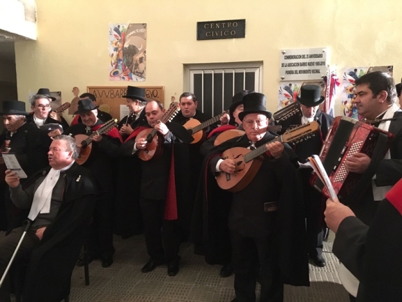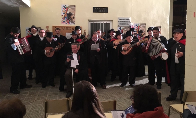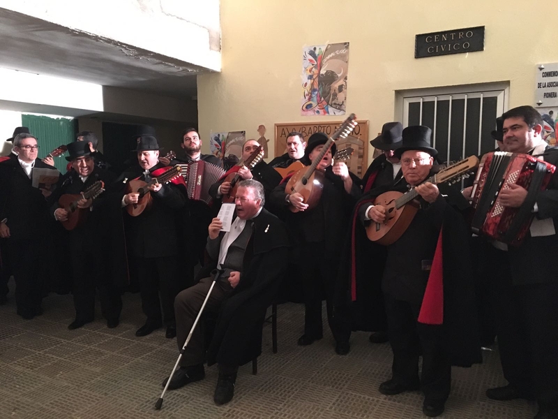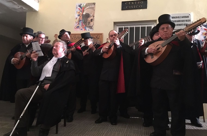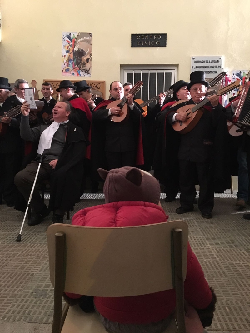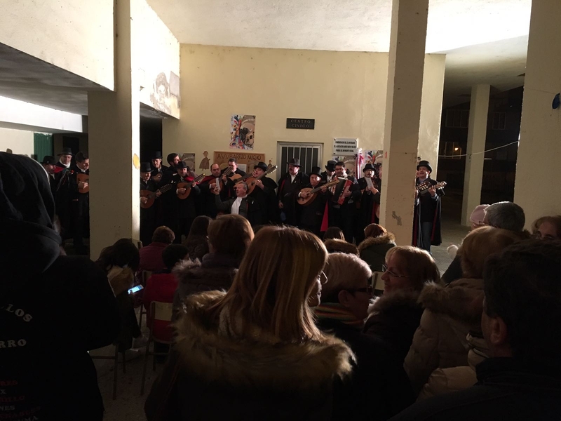La Rondalla III Columnas continuó en la noche del lunes con sus rondas precarnavaleras acercándose al Barrio Nuevo, donde ofreció una actuación en la zona de soportales del barrio, concretamente, a las puertas del Centro Cívico.