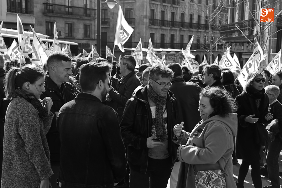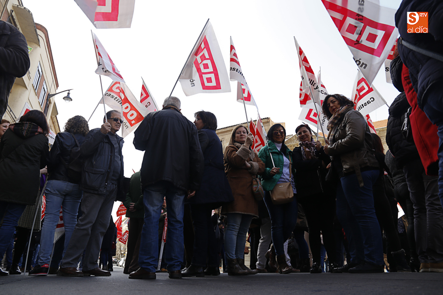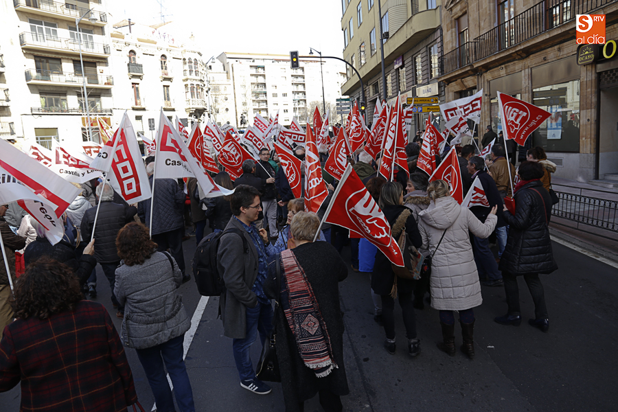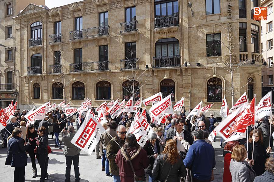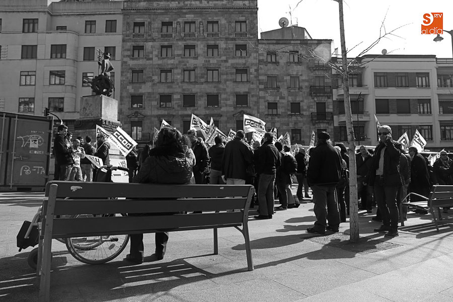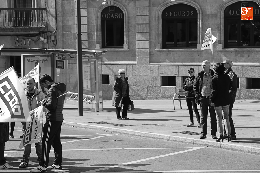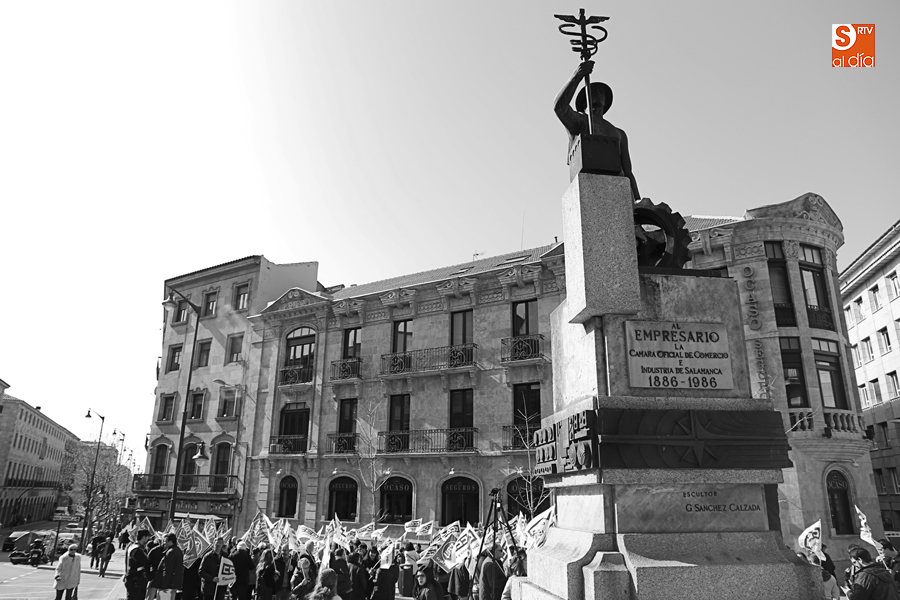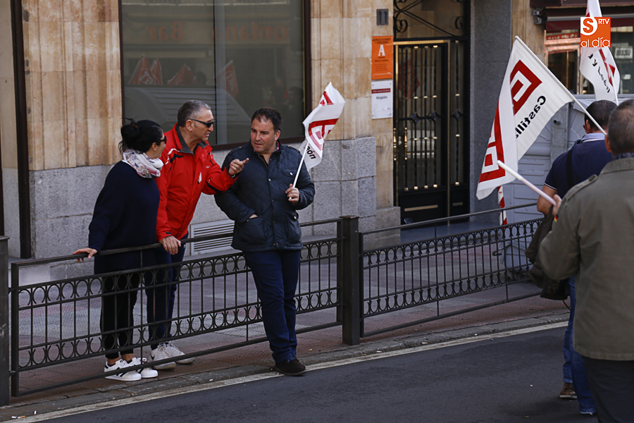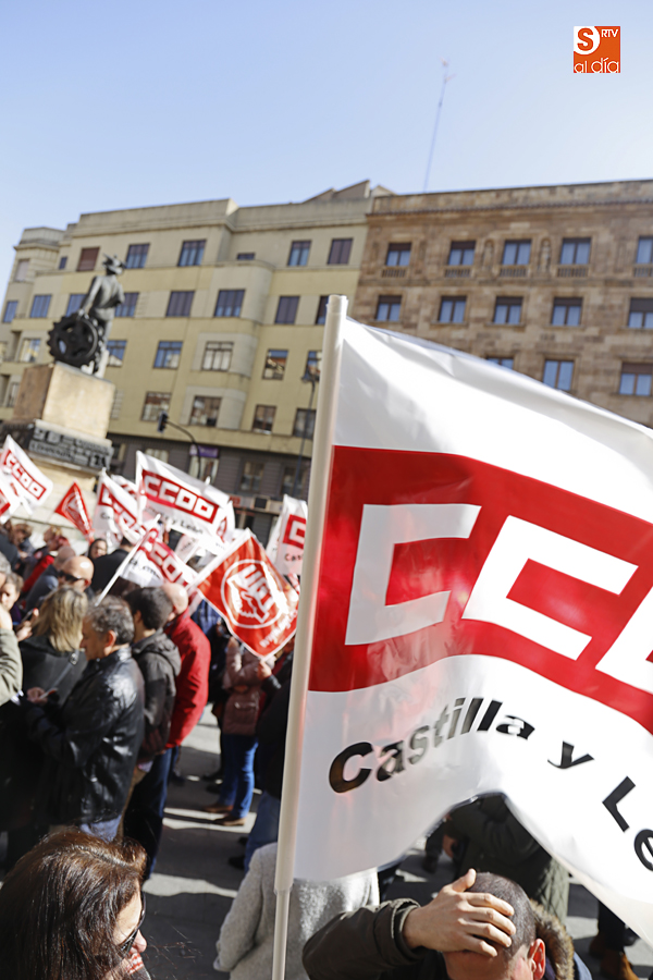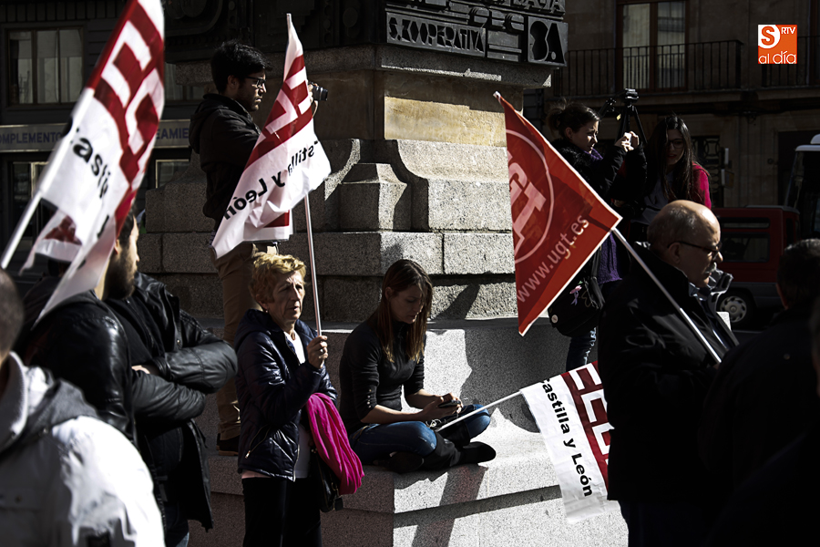 CCOO y UGT de Salamanca se han concentrado ante el Monumento al Empresario para reivindicar mejoras salariales y la firma de los convenios colectivos pendientes.